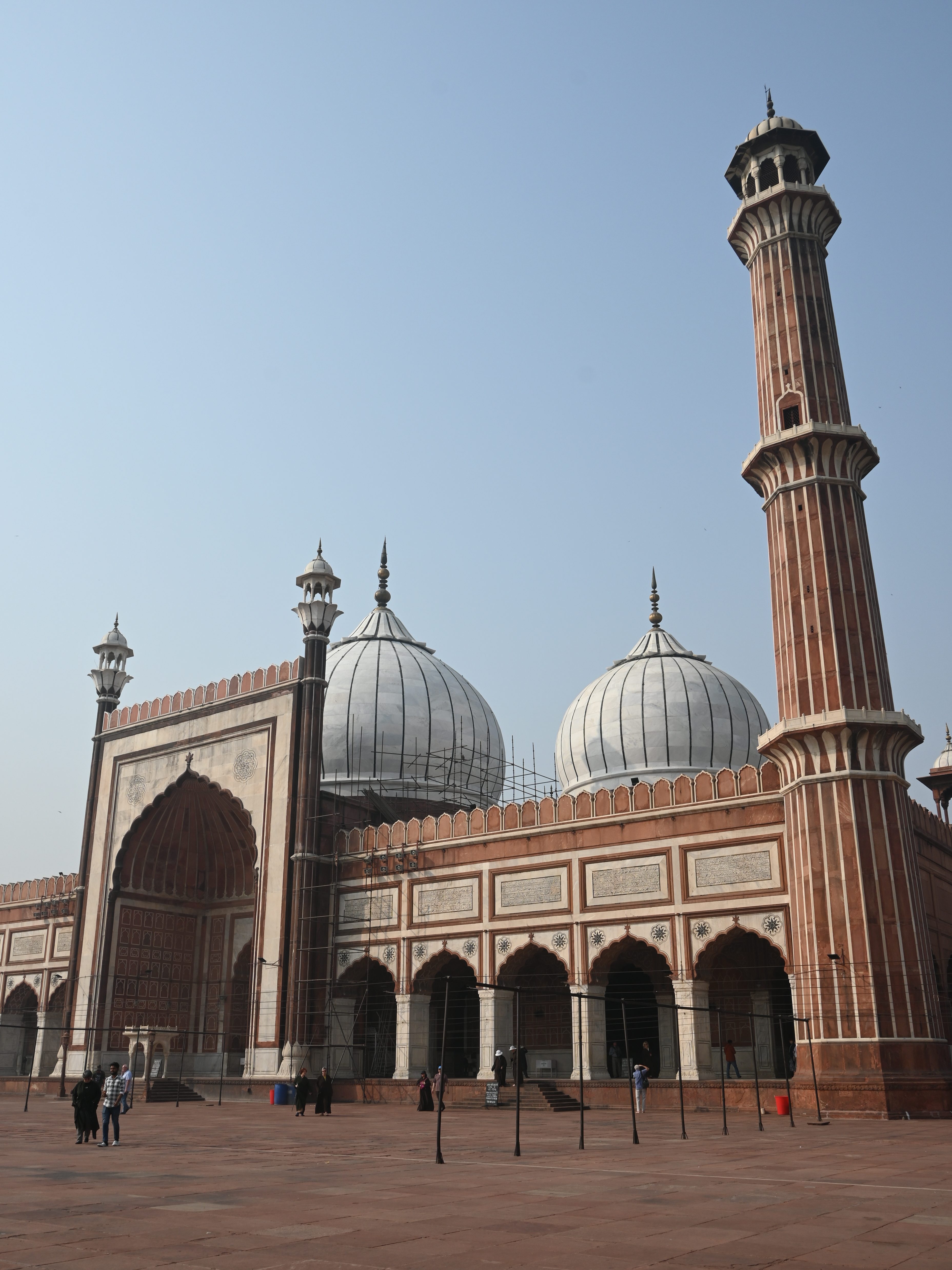 La llegada a la mezquita a primera hora de la mañana se siente como un oasis de calma entre la mugre de la ciudad, pero también el primer lugar donde empezamos a sentir que quieren cobrarnos por todo, una tónica en este área tan turística. La entrada a la mezquita son 300 rupias, más otras 50 por el alquiler de una túnica para mujeres, pues es obligatoria incluso llevando manga y pantalón largos. Además, hay que descalzarse y después te cobran 100 rupias más por haber «cuidado» de tu calzado amontonado con otras decenas de pares, durante unos 30 minutos o menos. Esto que acabo de describir sucederá de una manera u otra cada día y en cada zona turística.