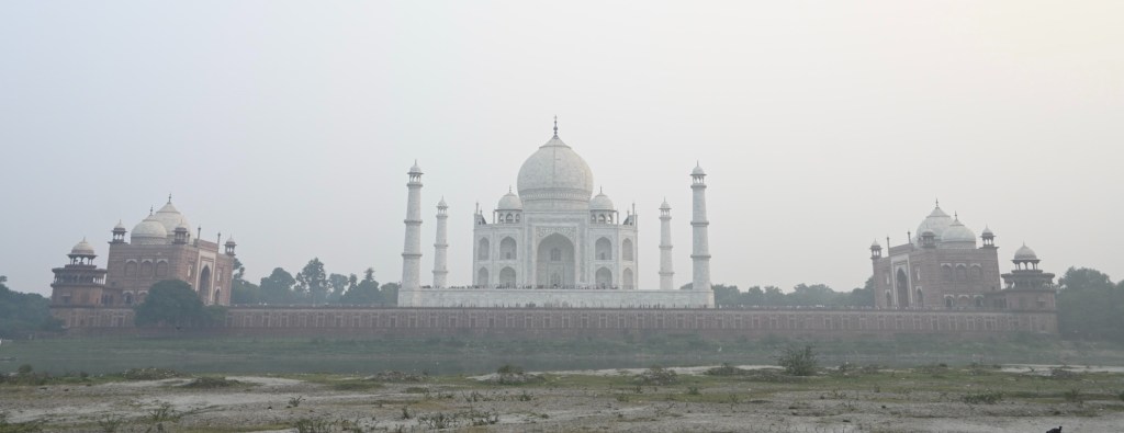 A la mañana siguiente, saliendo aún de noche del hotel, entrando en el recinto de la maravilla arquitectónica, vemos cómo el Taj Mahal se alza imponente a medida que el sol va asomando por el horizonte. La imagen sería perfecta si el color del sol lo tiñera todo de su característica tonalidad naranja pero esto no sucede porque el cielo está cubierto con esa especie de neblina que forma la polución extrema en la que está sumida el área en que nos encontramos, a pesar de que los guías de nuevo nos tomen por tontos haciéndonos querer creer que el humo se debe a los fuegos artificiales que se quemaron una semana antes en la festividad del Diwali.
