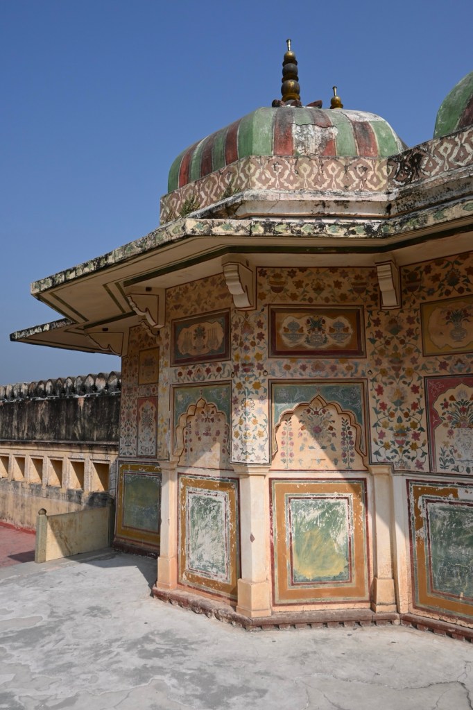 Una vez arriba, casi nada más entrar, no hay que perderse el templo hinduista construido enteramente en mármol blanco, destacando la imagen tropical de un platanero de mármol verde que me traslada al trópico en un espacio de pura belleza… Después, continuamos por las tres residencias del rey: la de verano, la principal y la de la época del monzón. Cada una de ellas está construida sabiamente en función de su finaldad, pero sobre todas ellas destaca la residencia principal, decorada completamente con espejos convexos que permitían hacer un efecto mágico al caer la noche y reflejar las llamas de los candiles centelleando en cada rincón de la residencia. Un buen guia podrá mostrarnos ese peculiar efecto en la zona más oscura de la residencia.
