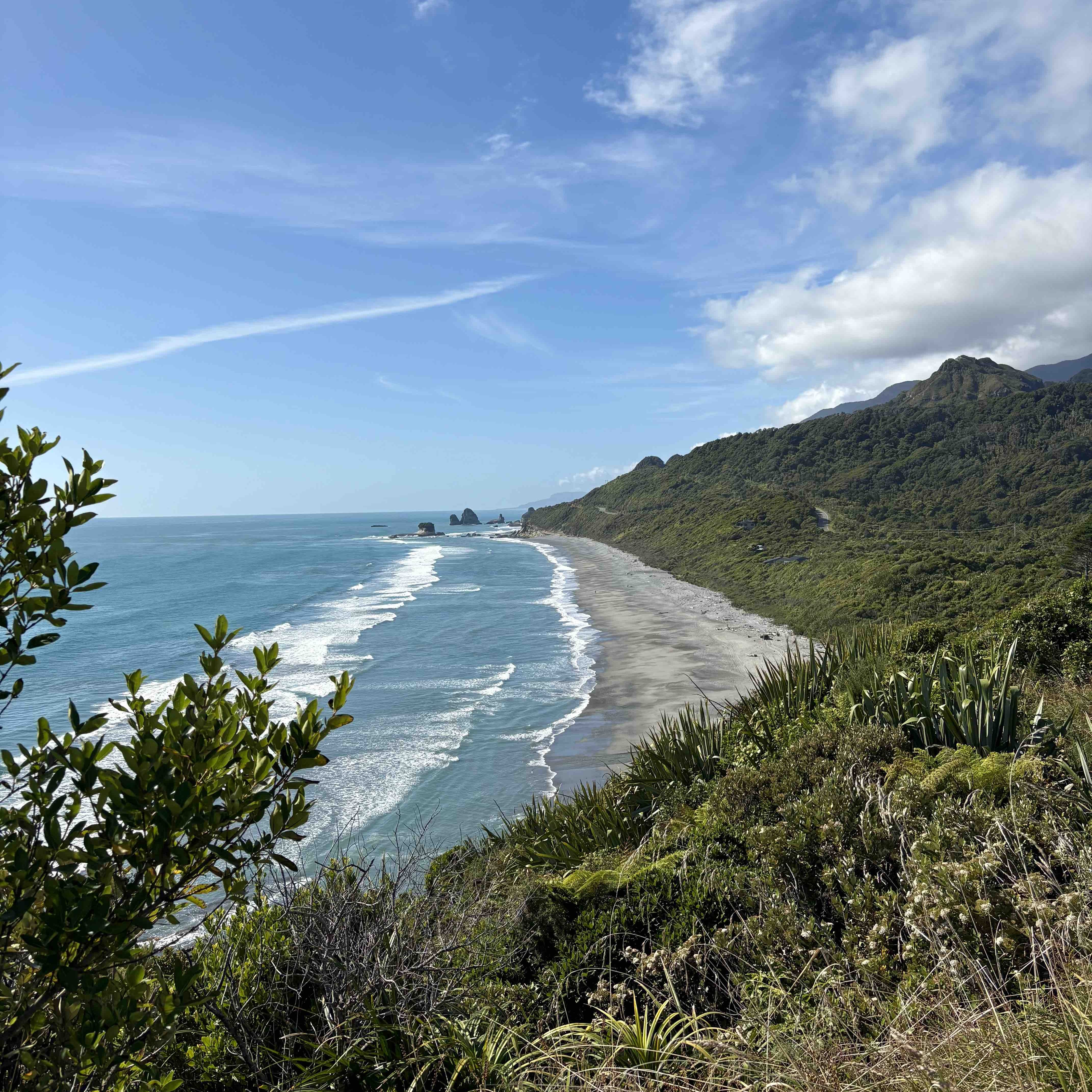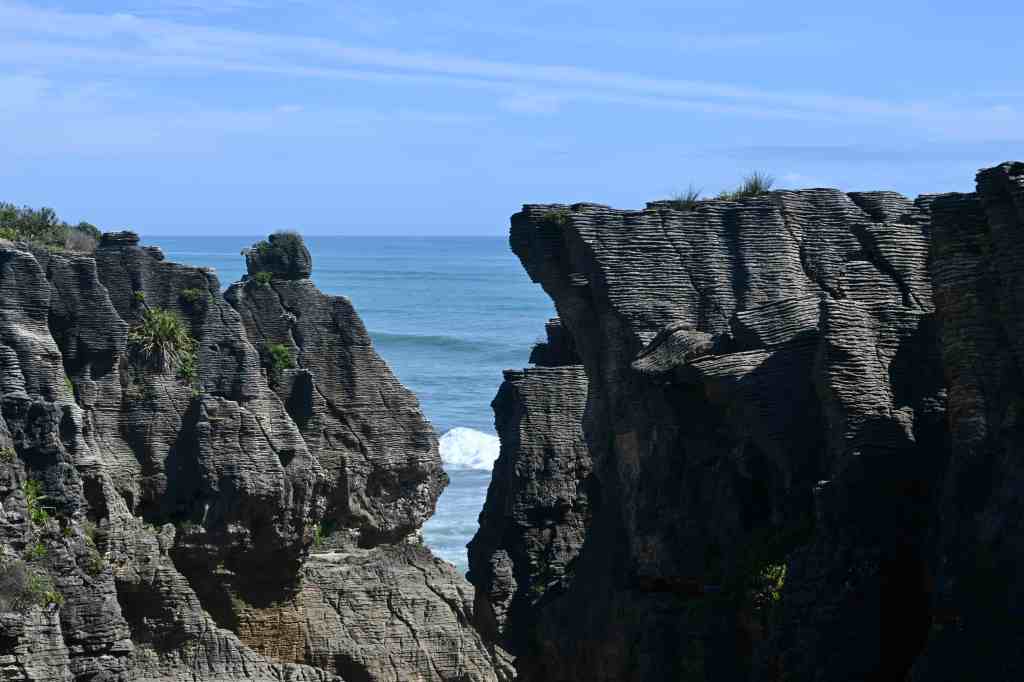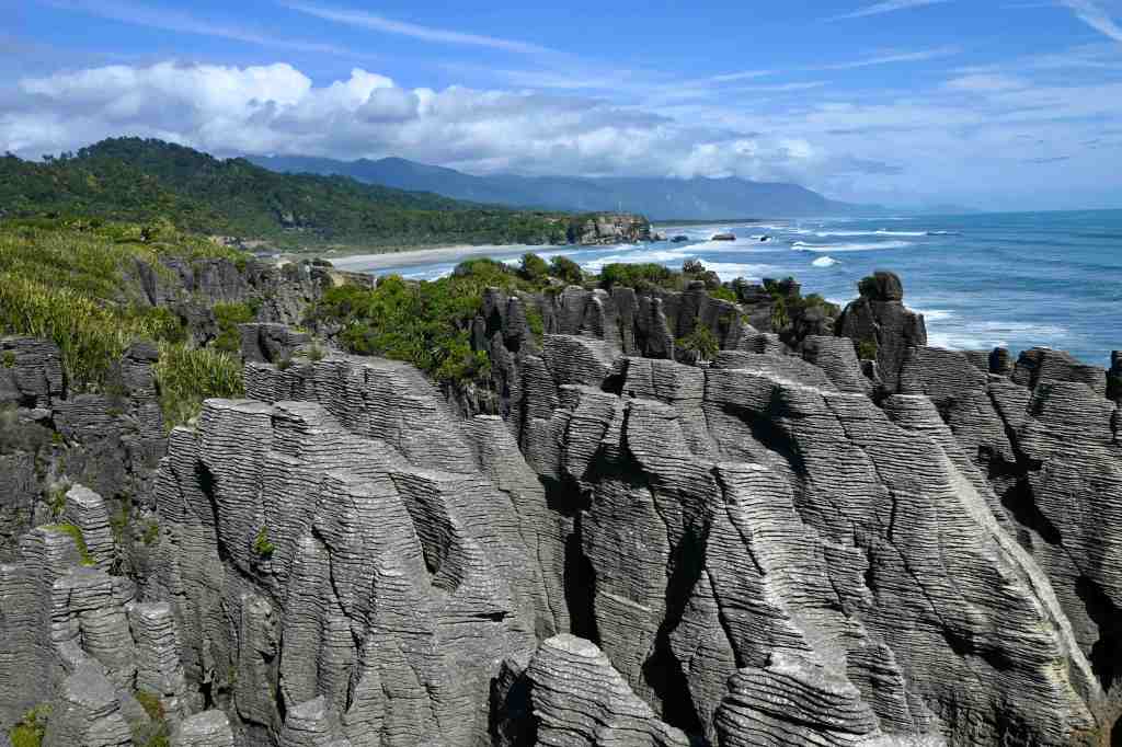 Los diversos climas y vegetación que se atraviesan en los apenas 300 kilómetros que separan una costa de otra, son lo más sorprendente: estaciones de esquí, montañas con nieves perpetuas, atravesamos ríos, una inmensa pradera, y por último, llegamos al bosque tropical en el que se encuentra la localidad de Punakaiki, visita imprescindible, famosa por las curiosas formaciones rocosas en la costa llamadas Pancake Rocks and Blowholes, ubicadas dentro del Parque Nacional Paparoa.