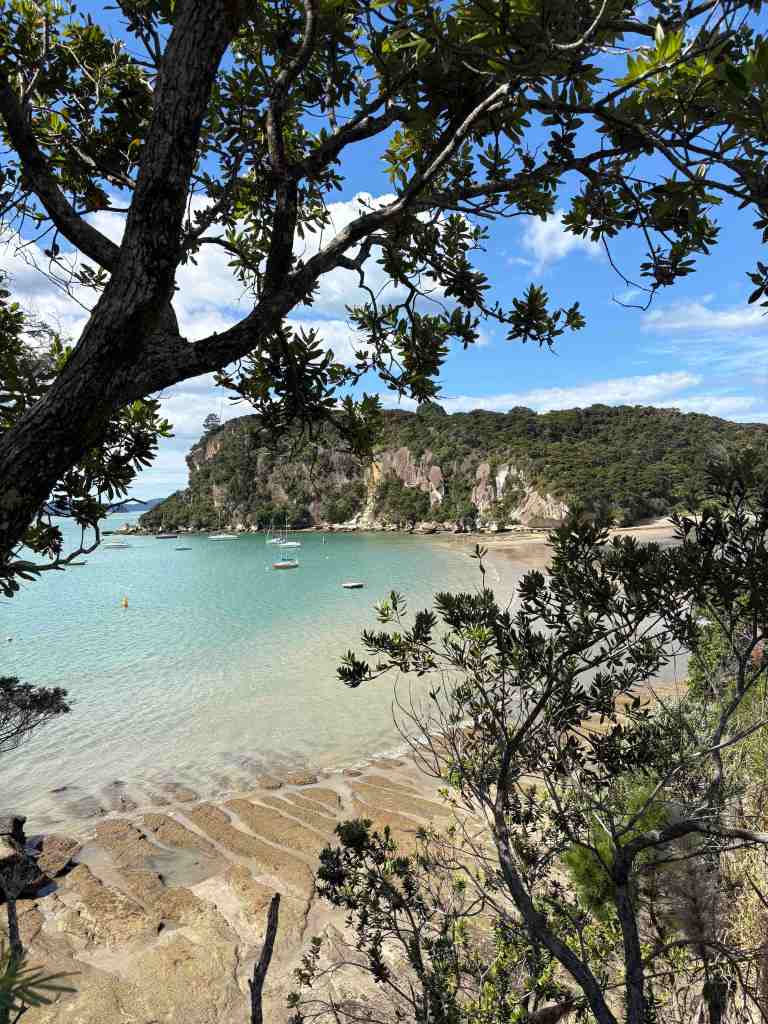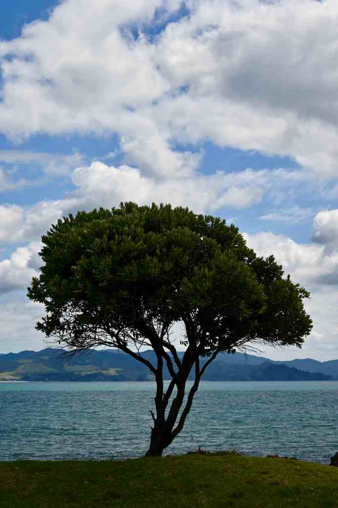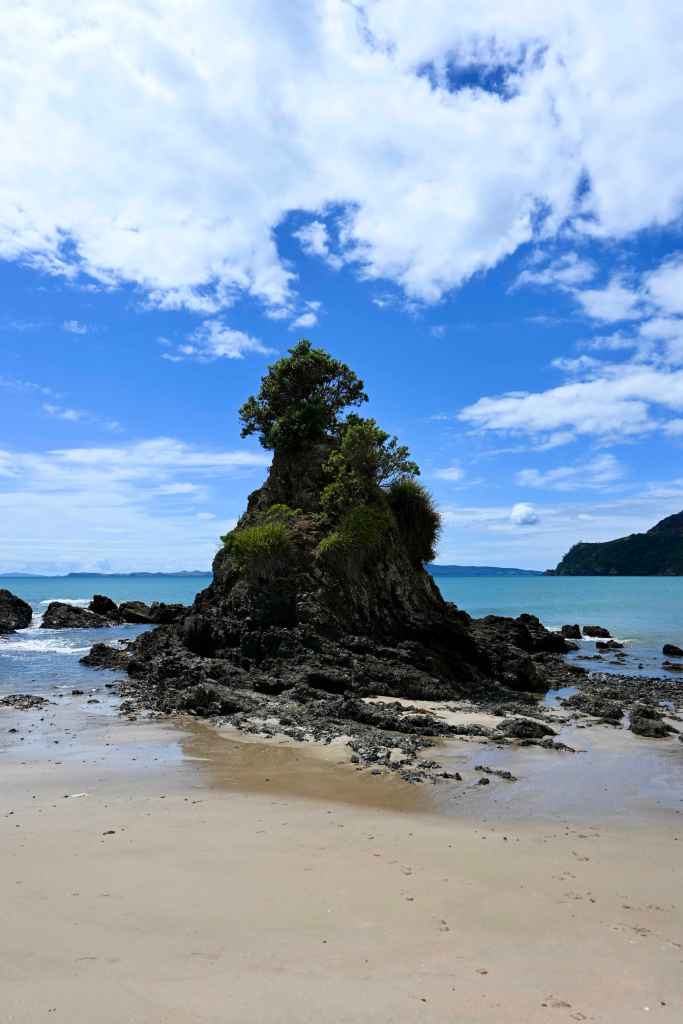 Continuamos hasta la animada localidad, más pequeña de lo que esperábamos, pero que resultó ser el tamaño ideal. Después, en numerosas ocasiones en el viaje, echaremos de menos el ambiente que aquí se respiraba. Una vez en Whitianga, cogemos unas bicis prestadas en el hotel y nos vamos al puerto para tomar el ferry con ellas incluidas, que en tan solo 5 minutos nos llevará al punto de enfrente, a la llamada Cook Beach. Allí hay varias cosas que hacer: podemos subir al mirador del acantilado de Shakespeare, también podremos ir al Lonely Bay, una playa solitaria con un acceso a través de numerosos escalones, que será el lugar donde nos demos nuestro primer baño en el país, o visitar el pueblo propiamente dicho, con preciosas casas a lo largo de la línea de playa. Merece la pena hacer este recorrido en bicicleta, pues la carretera tiene muy poco tráfico, buena parte de carriles bici y la distancia es un poco larga para hacerla caminando.