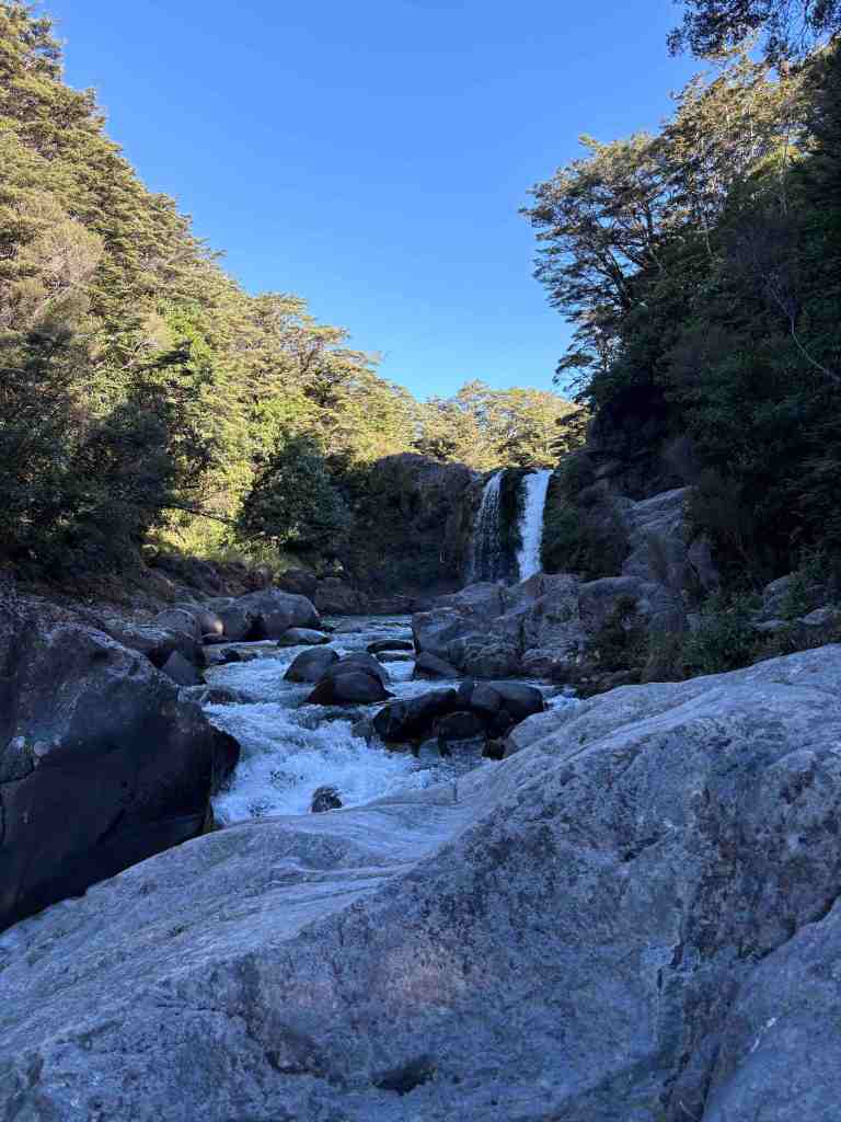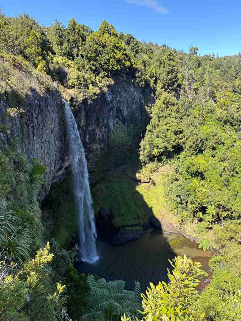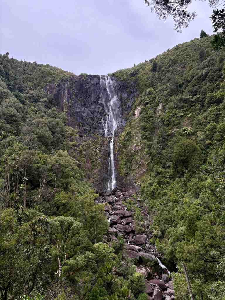 Continuamos en coche una hora más hasta las cascadas Wairere. Estas cascadas también están muy cerca de la carretera principal y una vez aparcamos en el parking desde donde empieza el camino tenemos 45 minutos de subida hasta el primer mirador. Después hay otros 45 minutos hasta el mirador que nos lleva al punto más alto de la cascada pero nosotros decidimos no hacerlo, yendo sólo hasta el primer mirador. Realmente es un trekking entre el bosque, la vegetación y los arroyos, que merece muchísimo la pena hacer. Las vistas son impresionantes, y la cascada, aunque no lleva mucho caudal ahora por ser finales de verano, es muy bonita, sobre todo por el entorno en el que se encuentra. Al final de nuestro viaje la catalogamos como una de las más bonitas que vimos en todo el país.