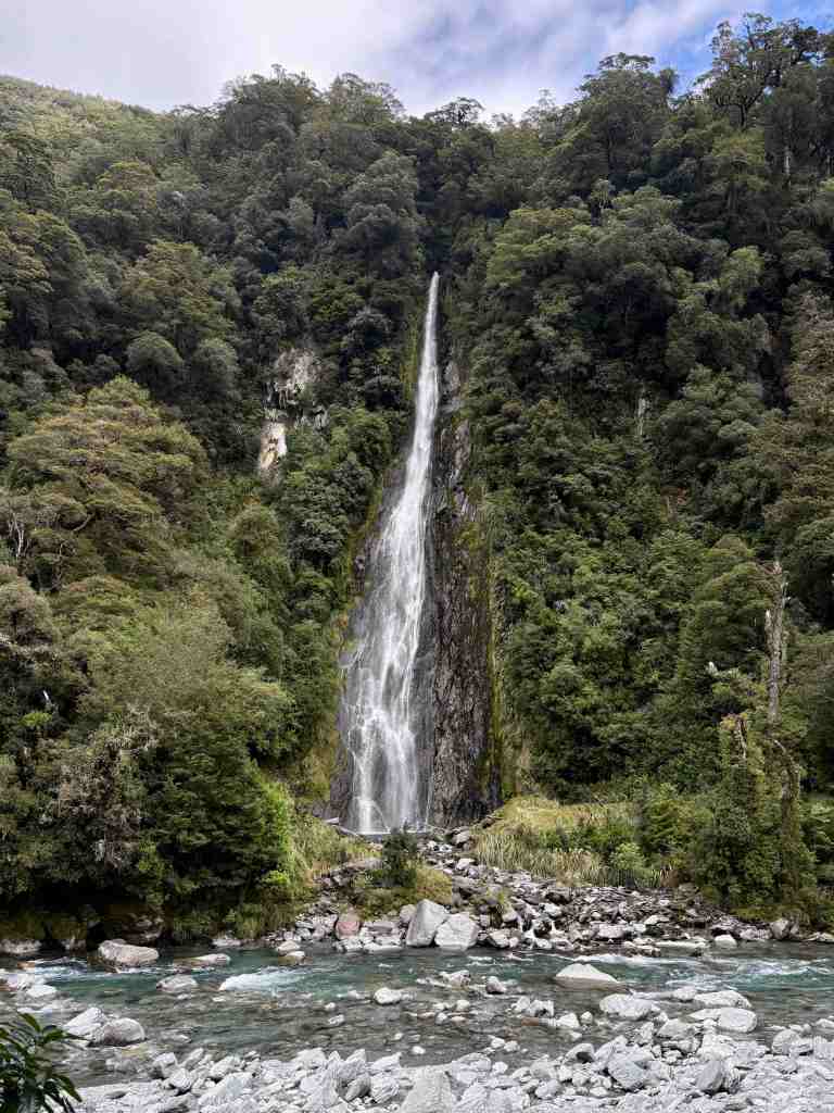 La primera parada tras abandonar Haast, a media hora, son las cascadas de Roaring Billy, muy cercanas a la carretera, a solo un paseo de diez minutos desde el aparcamiento. A estas le siguen las cascadas del arroyo Thunder, con una caída de 28 metros de alto y algo más impresionantes. Después pasamos por el mirador Gates of Haast, antes de llegar a la cascada Fantail, en la que sinceramente, no merece la pena ni detenerse después de haber visto las anteriores. Y después de esto, la joya de la corona, las Blue Pools, donde supuestamente puede hacerse un maravilloso sendero de una hora de duración, pero hace varios meses que estaba cerrado por causas de mantenimiento. Lo cual es una pena, pues era una de los lugares que más ganas teníamos de ver.