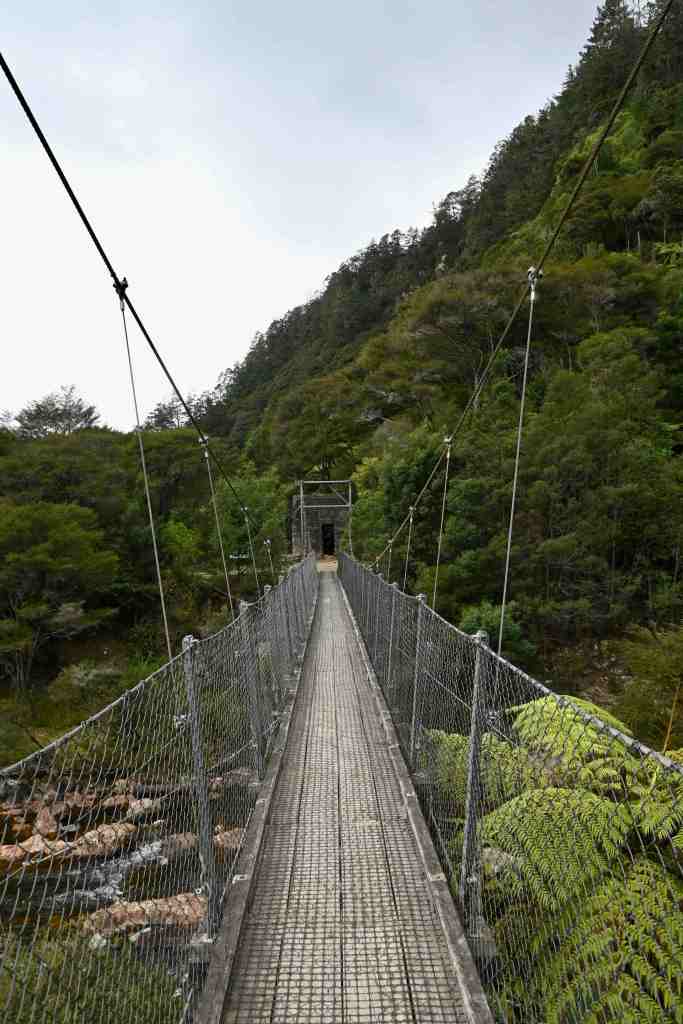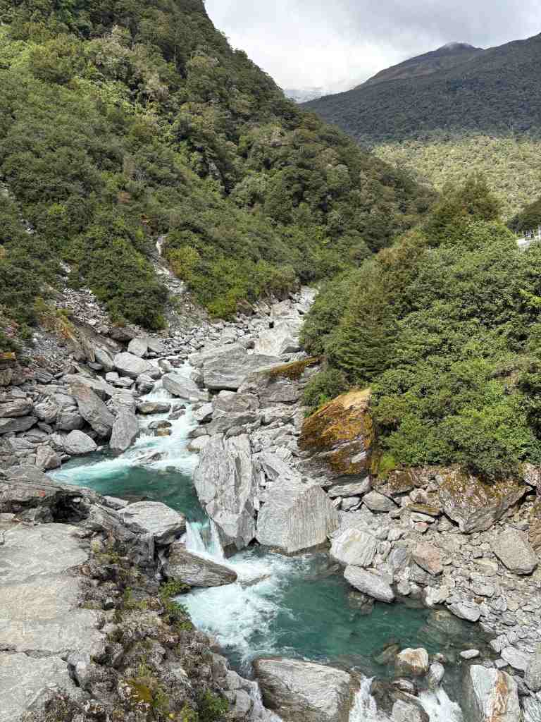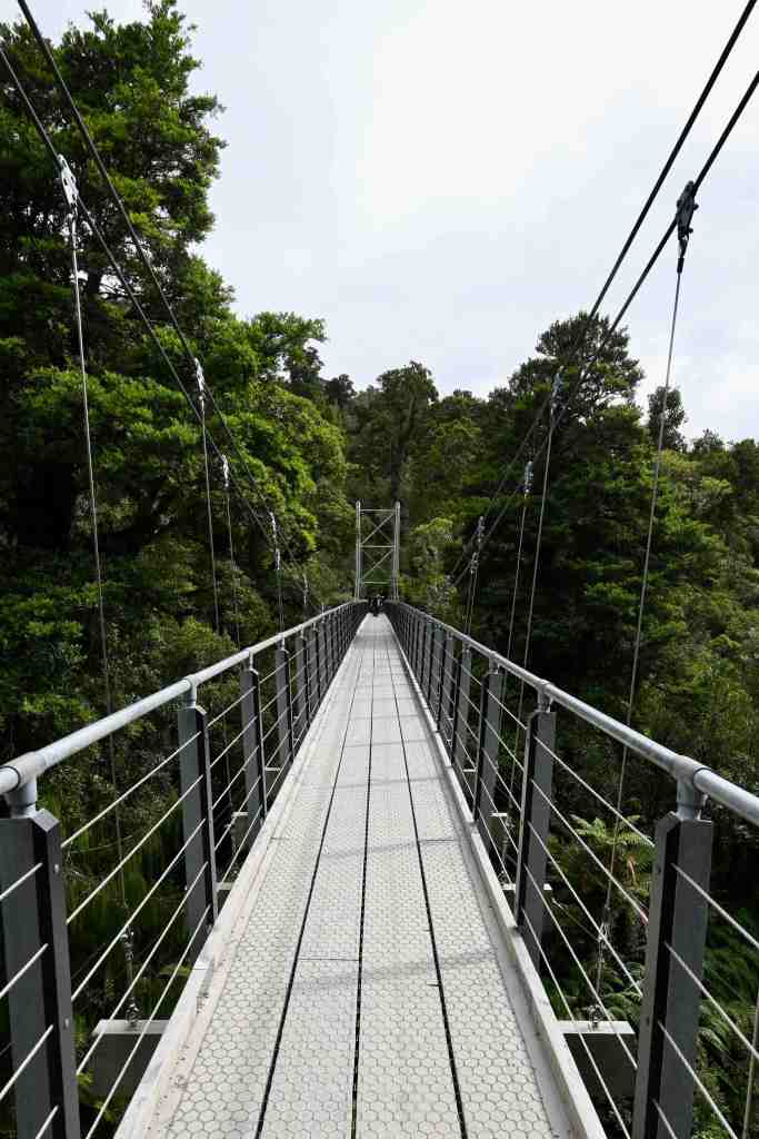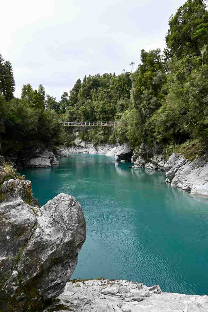 A media hora en coche de Hokitika tenemos la Garganta de Hokitika, un lugar altamente recomendable, pues en ella podemos impresionarnos con el intenso color azul turquesa de las aguas del rio de origen glaciar. Desde el aparcamiento tendremos la primera visión, pero lo que merece la pena es hacer el recorrido de una hora de duración aproximadamente, pasando por un puente suspendido con preciosas vistas, para llegar punto final: una especie de playa donde acercarnos un poco más a estas aguas y también tener una excelente panorámica. El camino es de ida y vuelta pero parece que se está habilitando otro puente para que pueda ser circular en un futuro.