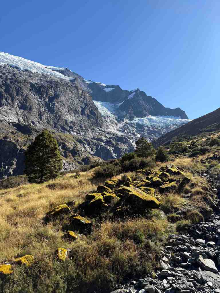 Como esas tres horas de caminata nos habían sabido a poco (sobre todo porque las hicimos muy rápido en un intento de escapar de la multitud), quisimos hacer otra ruta corta, en este caso de una hora de duración, que parte desde el mismo punto de inicio que la anterior, la llamada ruta de Kea Point, también muy sencilla, desde donde podremos tener vistas del monte, aunque no es tan impresionante como la anterior.