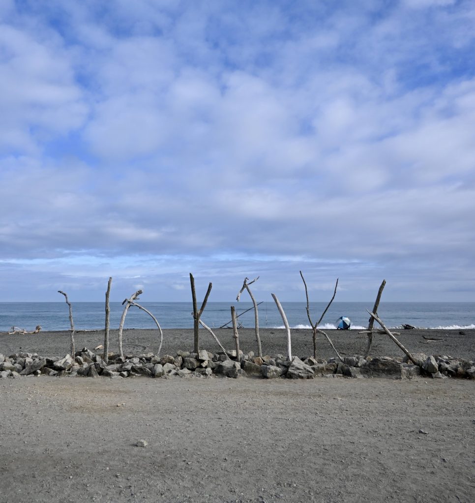 A primera hora de la mañana, aprovechando el tímido sol de primera hora del día, paseamos por el pueblo de Hokitika. La playa se ve muy diferente a la noche anterior, más frecuentada por lugareños paseando sus perros y también algunos turistas madrugadores. En las inmediaciones del mirador Sunset Point vemos muchísima madera de deriva, con la que algunos artistas locales han tallado esculturas a lo largo de la playa visibles desde el extraño paseo marítimo, si es que puede llamarse así.