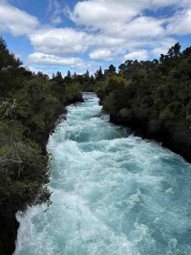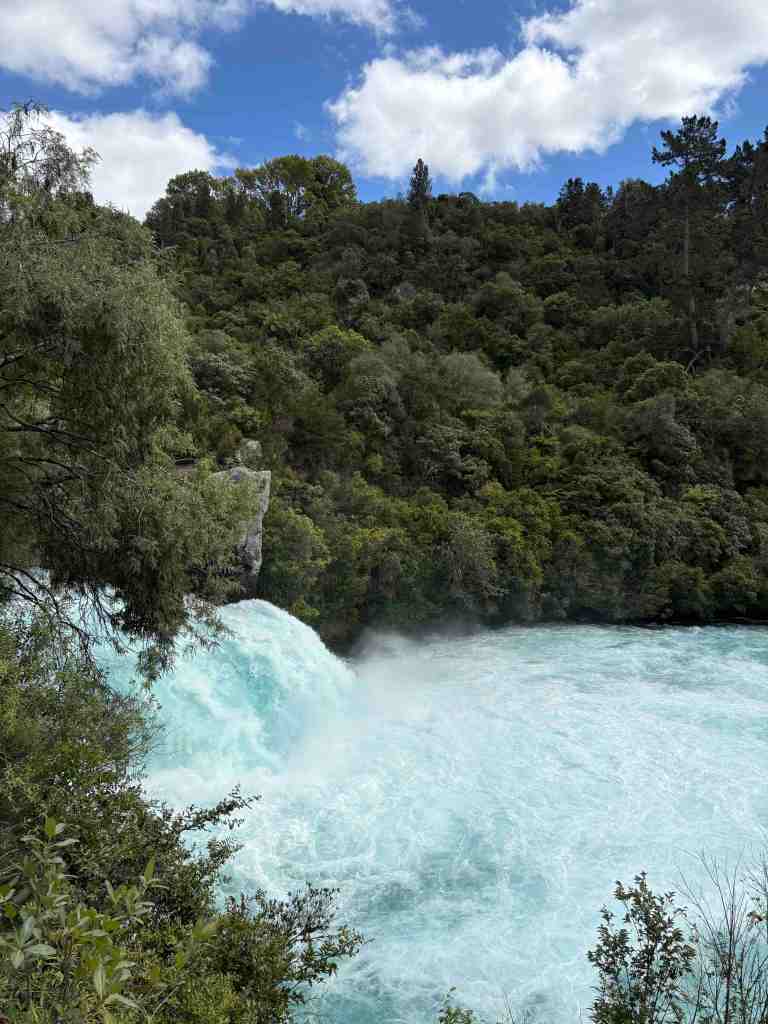 Llegando a Taupo, nos desviamos un poquito antes para ver las Huka Falls, las que dicen son las cascadas más visitadas en todo el país. Se puede aparcar directamente en las cascadas o como hicimos nosotros, aparcamos más cerca del pueblo, en el área termal pública y gratuita llamada Spa Termal Park, para empezar desde ahí el sendero que discurre a lo largo del río y termina en las Huka Falls. Este sendero tiene unas dos horas de duración ida y vuelta y es muy recomendable, pues desde numerosos puntos podemos ver el río con ese color azul turquesa intenso que lo caracteriza. Al llegar a las cascadas, ese color se acentúa y nos sorprendemos por la fuerza que tiene el rio llegando a la garganta en que desemboca en el famoso salto de agua, al que por cierto, se acercan los barcos para disfrute del turismo. Estos barcos pueden tomarse en el extremo opuesto, en el punto más alejado del pueblo. Todas las opciones están perfectamente señalizadas.