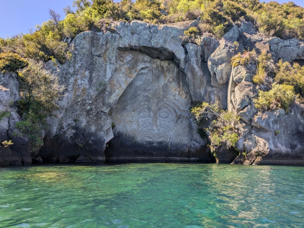 Sabiendo el buen pronóstico del tiempo, decidimos ir a ver las rocas grabadas con motivos maoríes en el Lago Taupo. Hay varias formas de visitarlas, la más común de ellas es con un tour organizado en barco o velero con actividades a bordo. Pero nosotros no somos de ese estilo y descubrimos que en la Bahía de Acacias, lugar cercano al núcleo urbano de Taupo, podemos alquilar un kayak por unas cuatro horas (tiempo suficiente para llegar a las rocas, disfrutarlas, hacer una parada para almorzar, y volver).
