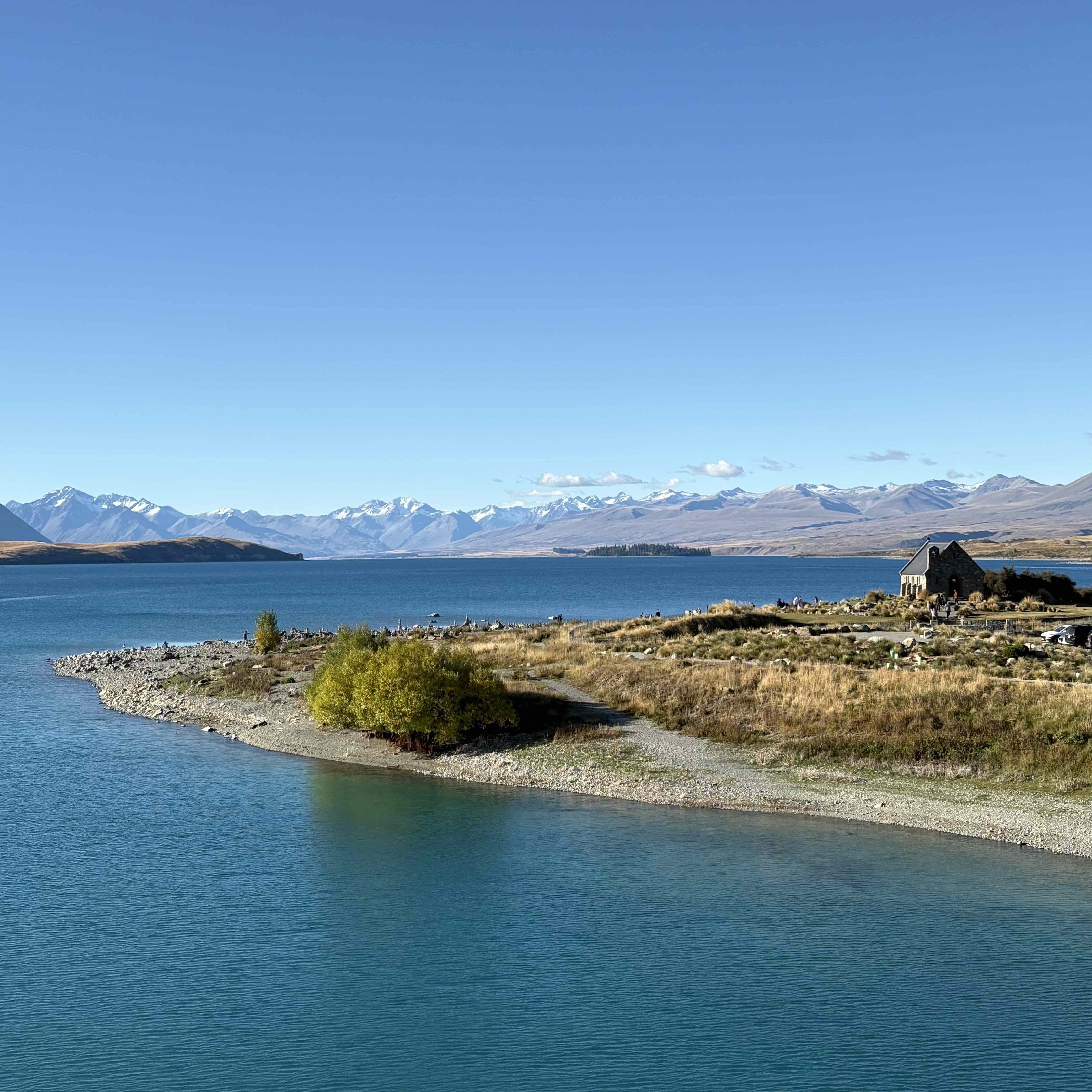 Nos separa aproximadamente una hora y cuarto de conducción hasta Lake Tekapo, aunque se hace un poquito más largo debido a las continuas paradas en los miradores, que ahora se han vuelto más llamativos gracias al azul intenso del agua cuando el sol está en su punto más alto. Además, con la tormenta del día anterior, llegaron las primeras nevadas en las zonas altas, y es precioso ver esa tímida nieve coronando algunos picos que, al día siguiente volverán a estar secos, cambiando completamente la estampa.