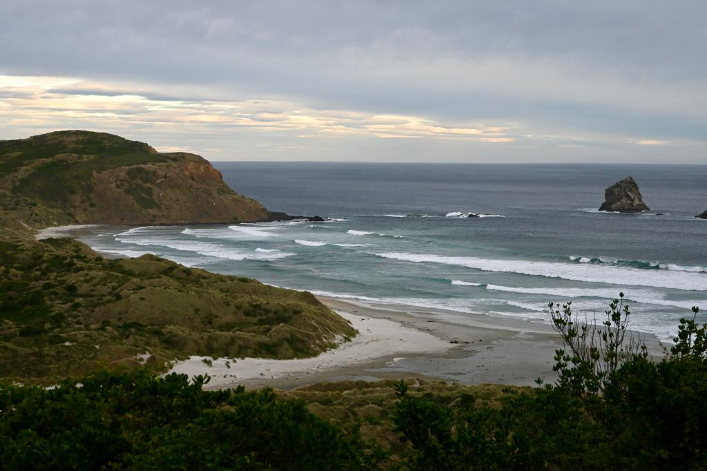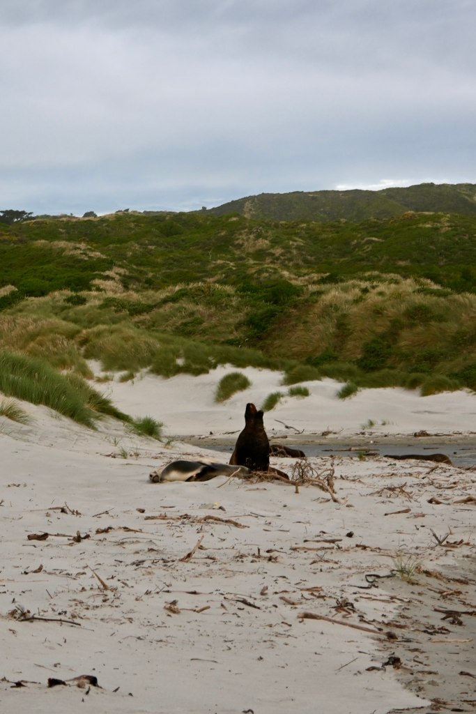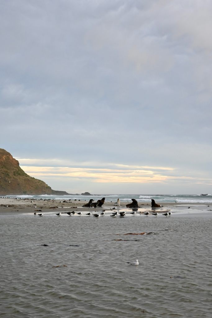 Y ahí es donde nos dirigimos después, gracias a que ha dejado de llover, a la Península de Otago, para tratar de ver leones marinos y pingüinos por nuestra cuenta, sin tener que pagar los desorbitados precios de los cruceros de una hora que parten desde algunos puntos de esta haciendo un tipo de turismo que si podemos preferimos evitar. Con este fin, un par de horas antes de caer la noche vamos a la playa de Sandfly, un lugar increíble donde tras aparcar el coche, hay que bajar una cuesta muy pronunciada entre las dunas (que después cuesta más subir).