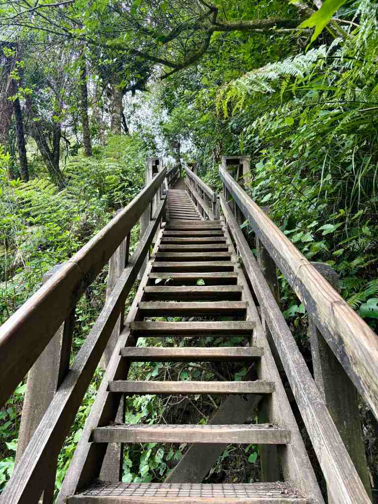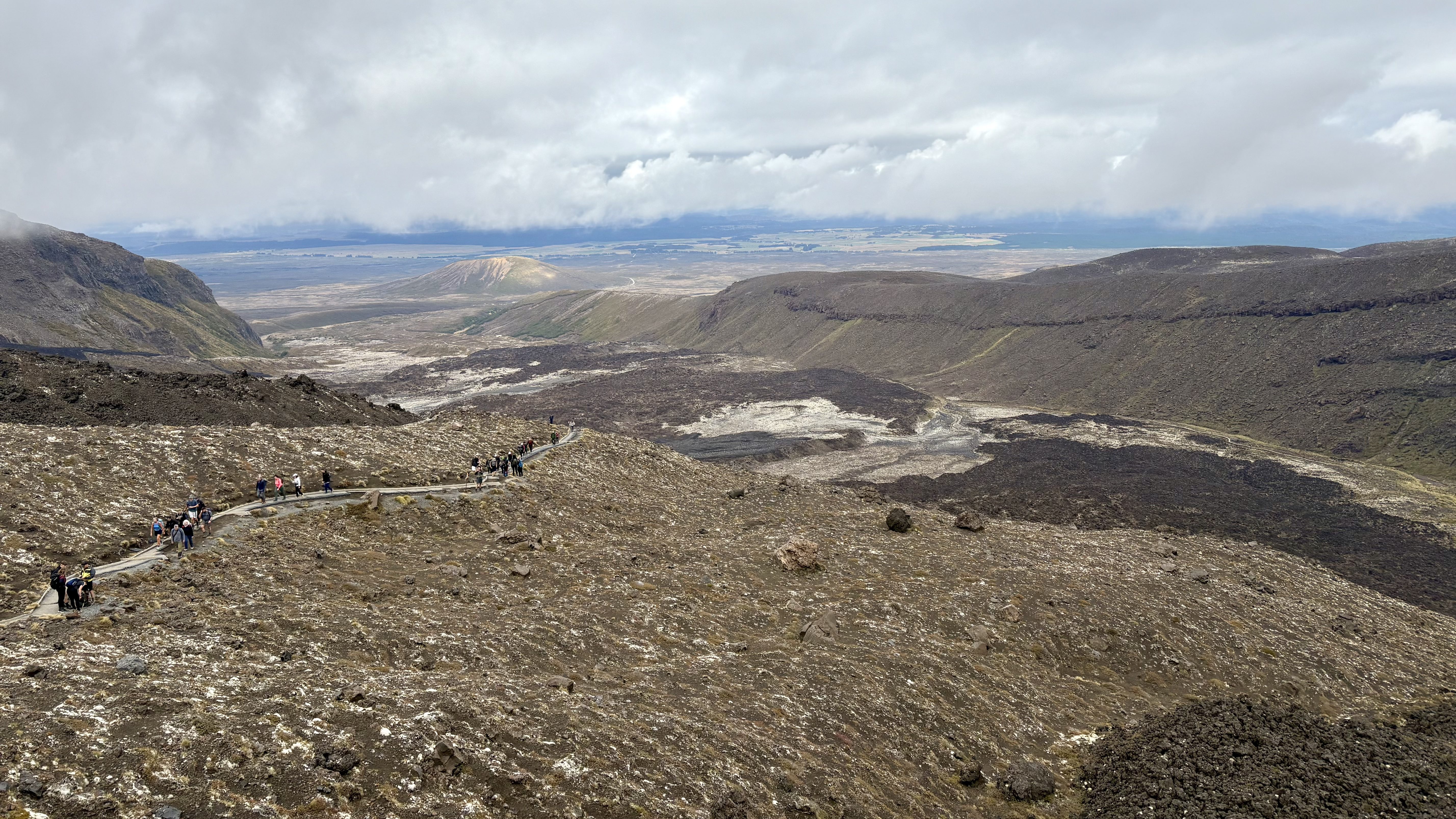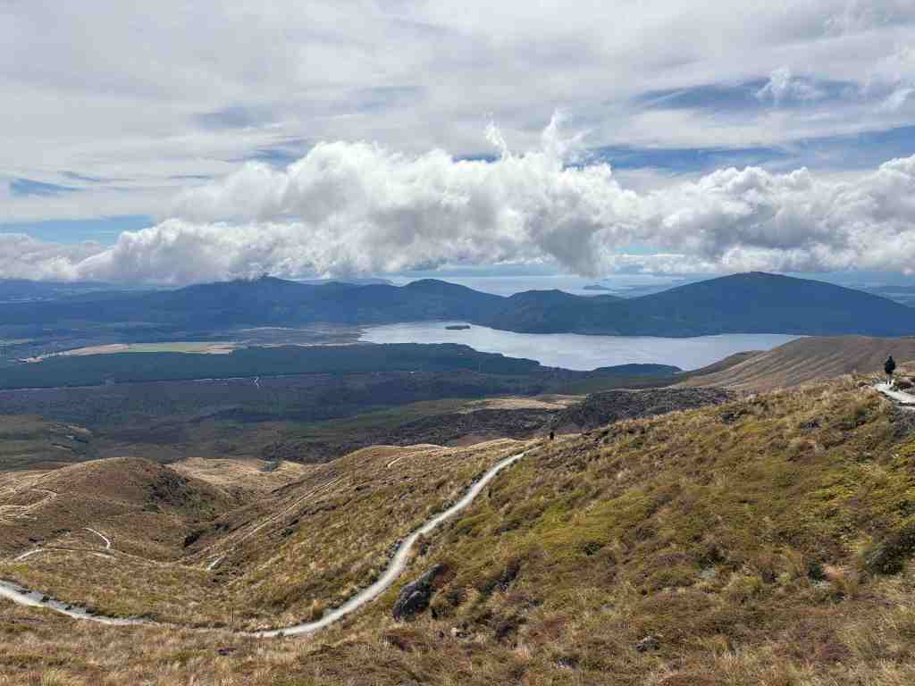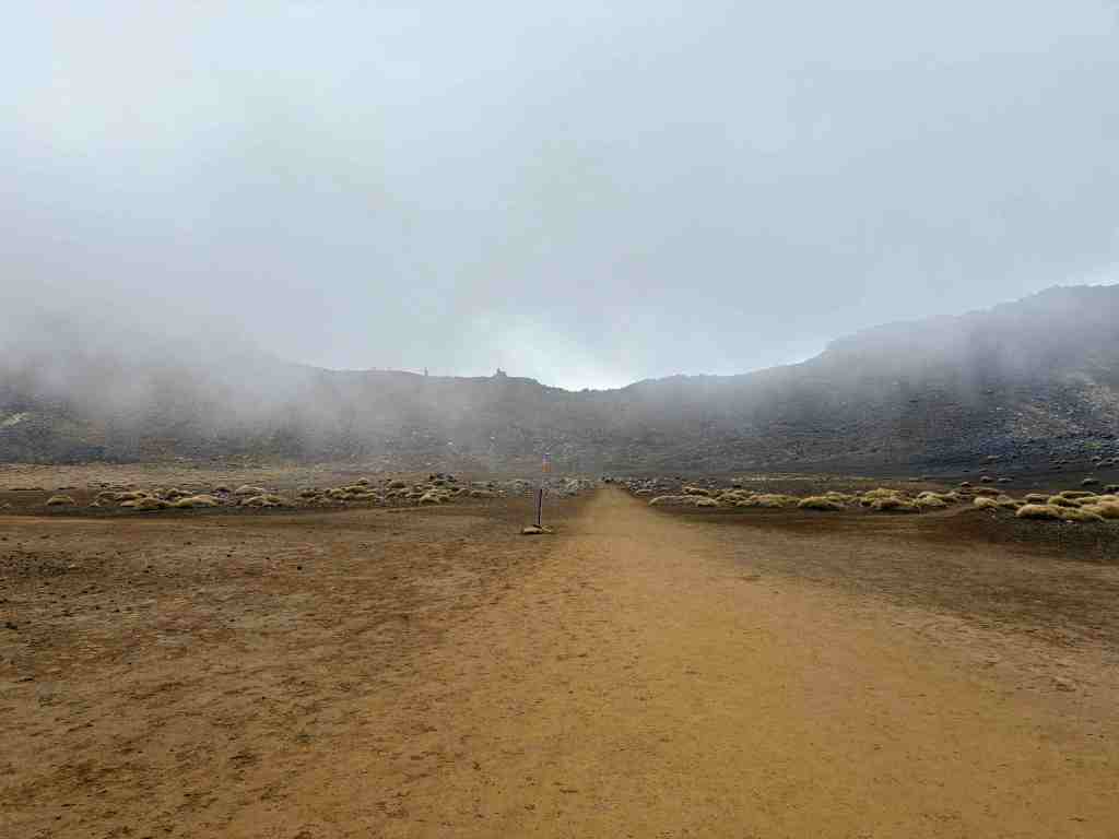 Por la mañana, para ir al Parque suele haber tres horarios de transporte desde diversos puntos de la zona, en nuestro caso estábamos alojados en el National Park Village y cogimos el bus intermedio, de las 7:15 de la mañana. En un trayecto de media hora aproximada llegamos al inicio del sendero, empezando a caminar casi a las ocho. A nosotros nos llevó 6 horas hacer todo el recorrido, con un par de paradas para comer algo, pero sin entretenernos demasiado, pues cerca de la cima el tiempo era horrible. El día comenzó medianamente soleado aunque empezó a cubrirse tras pasar la primera hora, cuando llegamos a Soda Springs, hasta aquí la ruta es un paseo. Tras este tramo tenemos la llamada Escalera del Diablo, un montón de escalones a los que subir sin tregua durante un par de kilómetros, rodeados de un impresionante paisaje volcánico. Luego nos llega la subida al Cráter Rojo, un tanto más exigente, donde encontramos varios ascensos, alguna pradera en la que llanear, y luego la subida más pronunciada y estrecha al punto más alto posible junto al cráter. En nuestro caso pudimos sentir el viento, pudimos notar que estábamos en medio de la nada, con nada alrededor más que nubes y un frío helador, pero no pudimos ver mucho… Hasta aquí habremos subido cerca de 750 metros, y a partir de entonces es casi todo bajada, unos 11 kilómetros de bajada, aunque el primer tramo bajando, hasta los Emerald Lakes es el más complicado, pues el camino está formado por tierra suelta que se desprende a cada paso, donde unos cuantos dejan su culo en el suelo si no se andan con mucho cuidado. El llegar a los Emerald Lakes, por suerte, las nubes abrieron un pequeño claro y pudimos ver algo (aunque en la foto no se aprecie tanto) mientras hacíamos nuestro descanso para reponer fuerzas. Luego continuamos hacia el Blue Lake, donde también pudimos vislumbrarse un poquito, y a partir de ahí, cruzamos la vertiente de la montaña y el día cambió completamente, presentándonos una maravillosa vista soleada del Lago Taupo, que nos acompañó durante toda la bajada. La última hora aproximadamente, el camino se empieza a tupir y a adentrarse en la vegetación hasta encontrarnos completamente caminando en el bosque húmedo, haciendo precioso y agradable este último tramo. A llegar, tenemos que esperar unos 45 minutos a nuestro Shuttle de vuelta a National Park Village, pero no vamos cansados, vamos satisfechos y sonrientes de haber hecho este camino, a pesar de que no hemos tenido el mejor de los climas.