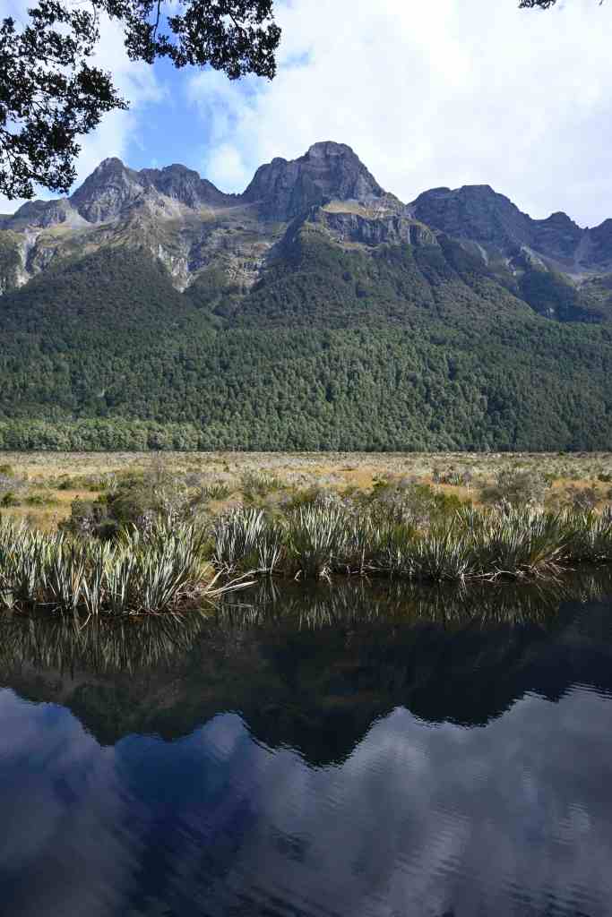 En el camino hacemos paradas en prácticamente todos los miradores en los que la montaña se ve despejada de nubes, y por supuesto, en el conocido como Mirror Lakes, donde un lago cercano a la carretera provoca un bonito efecto espejo de las montañas que nos rodean. Pensábamos que en esta carretera no había nada de vida pero no es cierto, hay varios campings, lavabos y algún que otro área de picnic donde aprovechamos para comer antes de tomar nuestro barco reservado a las 15:55 horas.