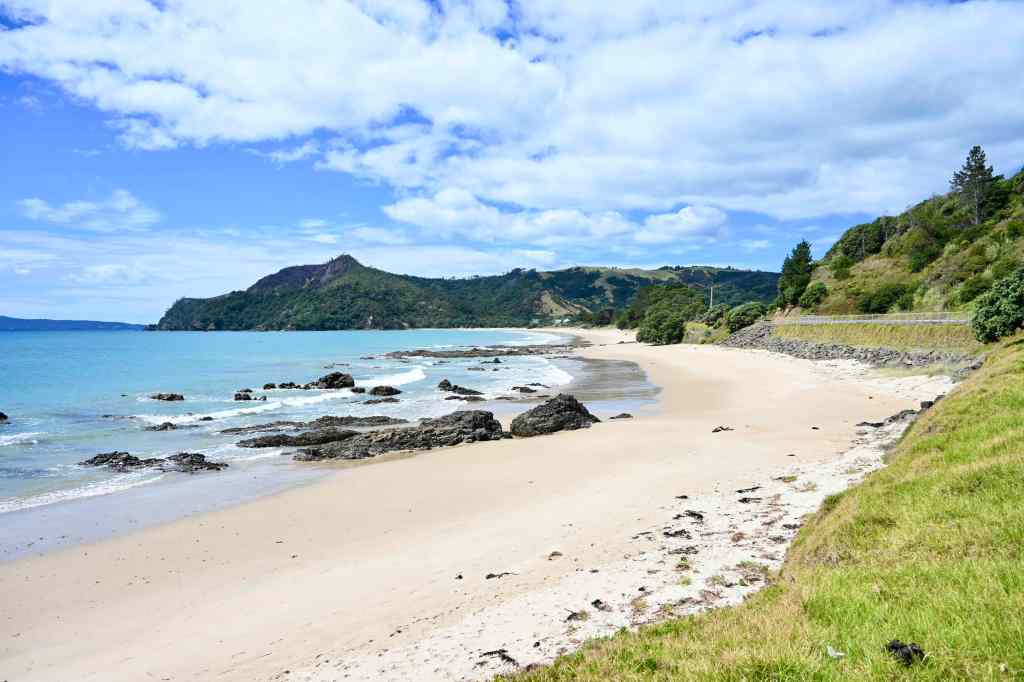 La carretera continúa entre verdes praderas y azules mares que asoman entre las laderas, hasta que antes de llegar a la ciudad de Whitianga, a unos 20 minutos de ella, pasaremos por la playa de Kuaotunu, un auténtico remanso de paz y belleza.