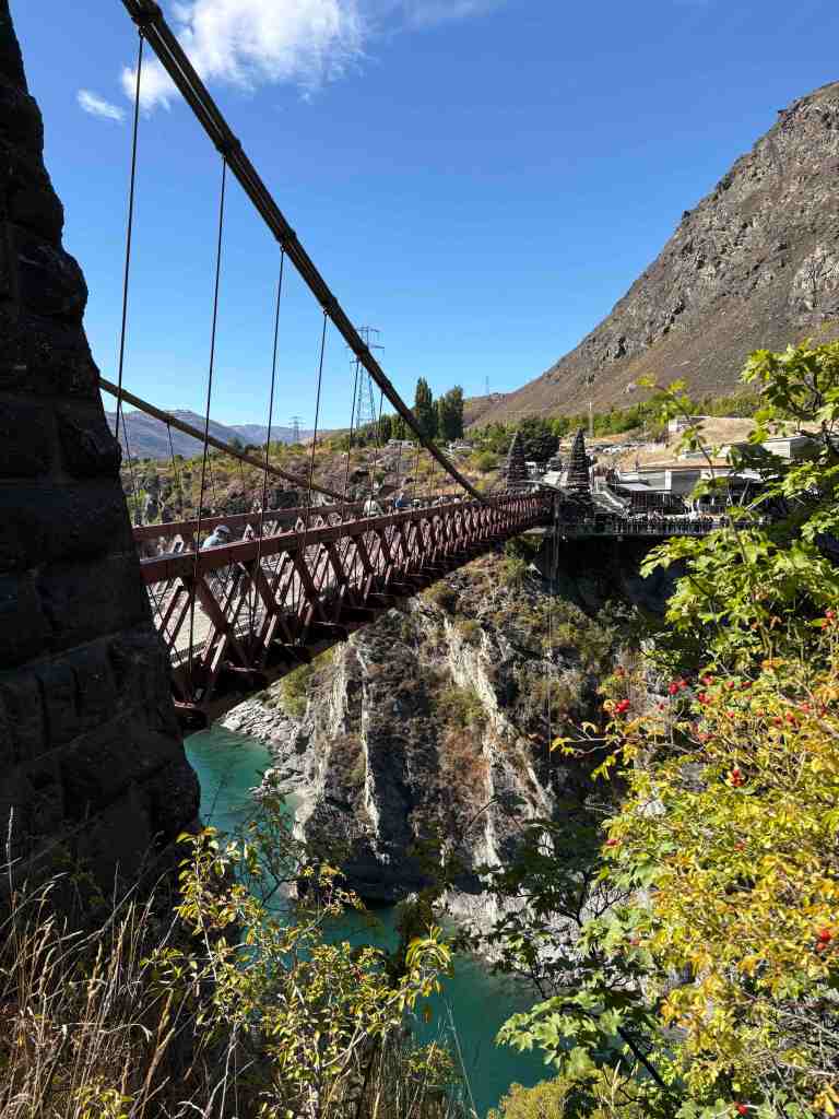 En Arrowtown alquilamos un par de bicicletas para hacer el Arrowtown River Trail, una ruta de 13,4 kilómetros de ida que parte del centro urbano, atraviesa varios puentes colgantes a la largo del río, y termina en el puente de Kawarau, donde podemos ver a algunos valientes haciendo puenting… El camino es precioso, un poco exigente para quien no esté acostumbrado a ir en bici (pero para eso ofrecen la posibilidad de alquilar bicicletas eléctricas en todas las tiendas) y se hace aún más bonito a medida que llegamos al final del sendero. Vamos ganando altura y vemos cómo el rio que estaba a nuestros pies ahora queda encajado en una profunda garganta.
