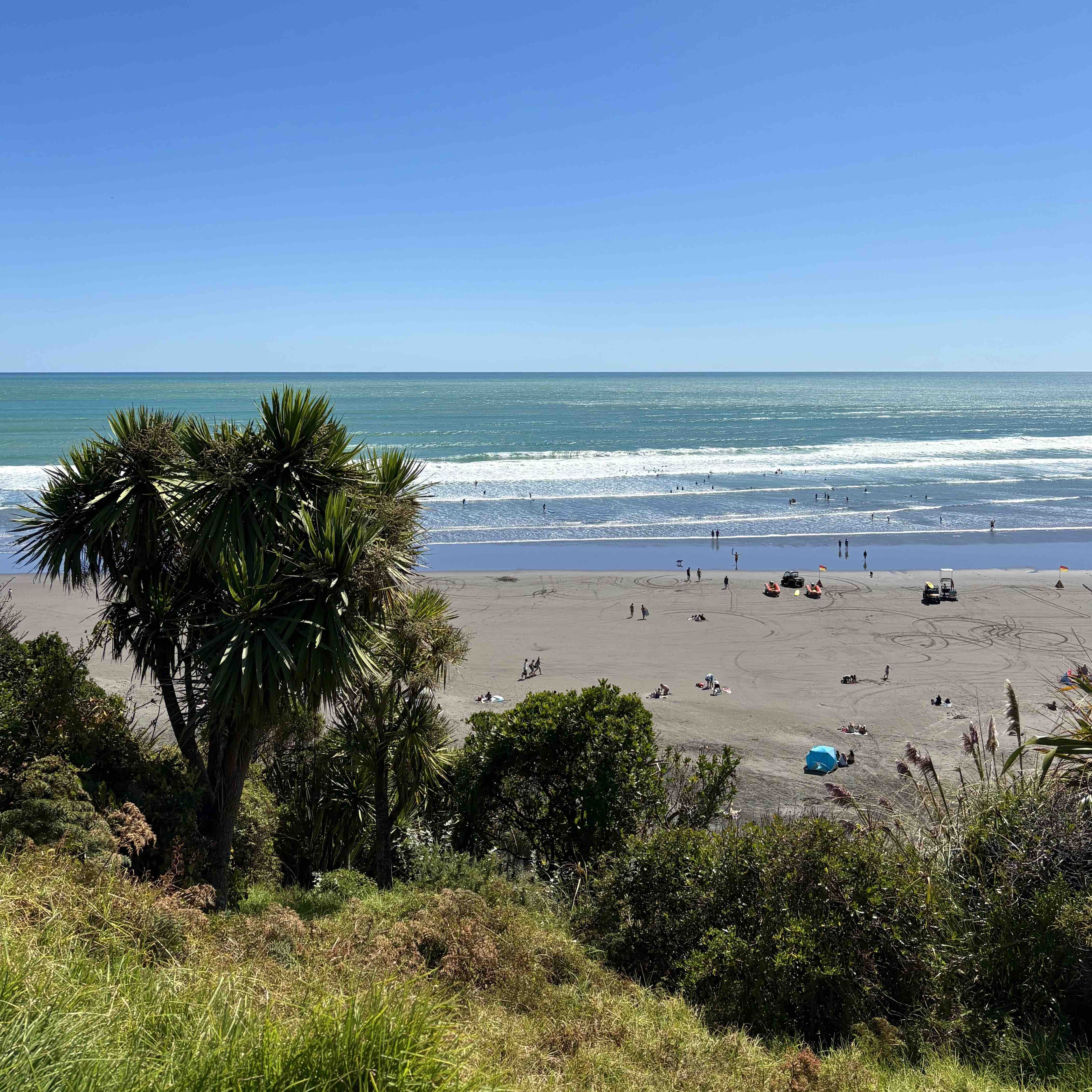 Amanecemos en esta ciudad con la intención de ir a visitar las populares Cuevas de Waitomo, donde la atracción es dar un paseo en barca por un río subterráneo viendo luciérnagas en la oscuridad. Sabíamos que queríamos verlo y por eso hicimos noche aquí, pero tampoco habíamos buscado mucha información, lo hicimos la noche anterior, y gracias a eso, decidimos no gastar 45 euros por persona para dar un paseo en barca de 10 minutos y ver algunas luciérnagas de lejos y sin poder hacer fotos, tal y como dicen muchas reseñas. La verdad es que nos pareció un atraco. Así que después del cansancio del día anterior, decidimos poner rumbo a la ciudad costera de Raglan para intentar tener un relajado día de playa en nuestro último día de estancia en la Isla Norte. Esta localidad tiene muy buen ambiente y está repleta de bares y tiendas con carácter surfero. Nos dio muy buena vibra, más aún siendo domingo, día en que se celebra un mercadillo de segunda mano y las tiendas sacan sus productos a las calles. Sumado a que hacía un día de sol esplendido y pudimos pasar un buen rato en la pintoresca playa de arena negra situada en las afueras, que presume de ser la que tiene la ola más larga de toda Nueva Zelanda.