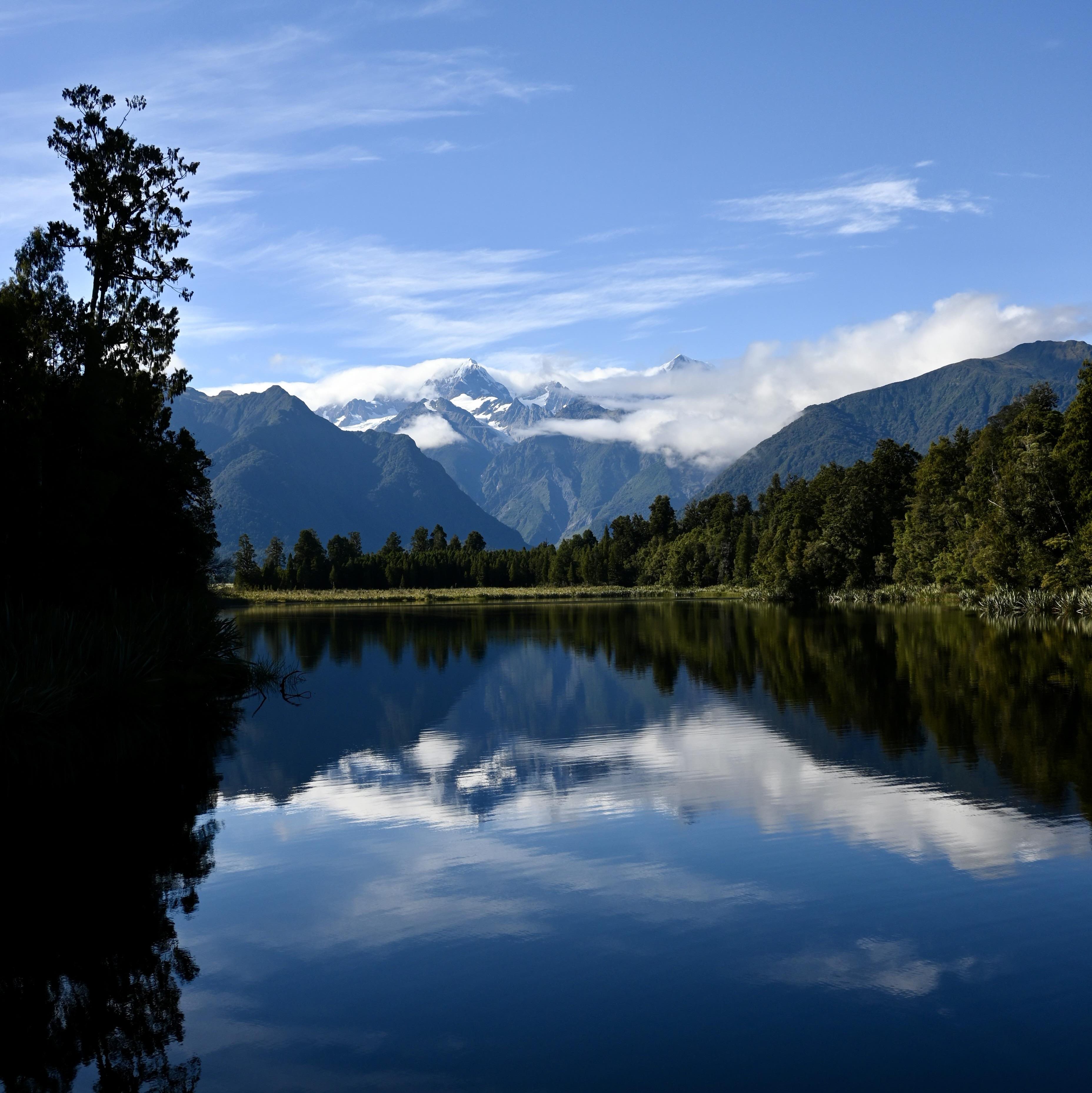 Esa carretera termina ahí, en el mirador. Así que hay que tomarla de vuelta al pueblo, y a medio camino más o menos, tenemos el acceso al Lago Matheson, uno de los lugares más emblemáticos del país, pues el mágico reflejo de las montañas y los glaciares en sus aguas ha hecho que haya sido portada de numerosas revistas, estampado en postales y se haya convertido un símbolo nacional. Una vez aparcado el coche, hay opciones cortas y largas para caminar alrededor del Lago, nosotros tomamos la larga, para verlo todo, pues supone solo alrededor de una hora y cuarto, incluyendo las paradas para sacar fotos en sus tres miradores, entre los que se encuentra la Reflection Island. Es un paseo diría que obligado si el día está despejado.