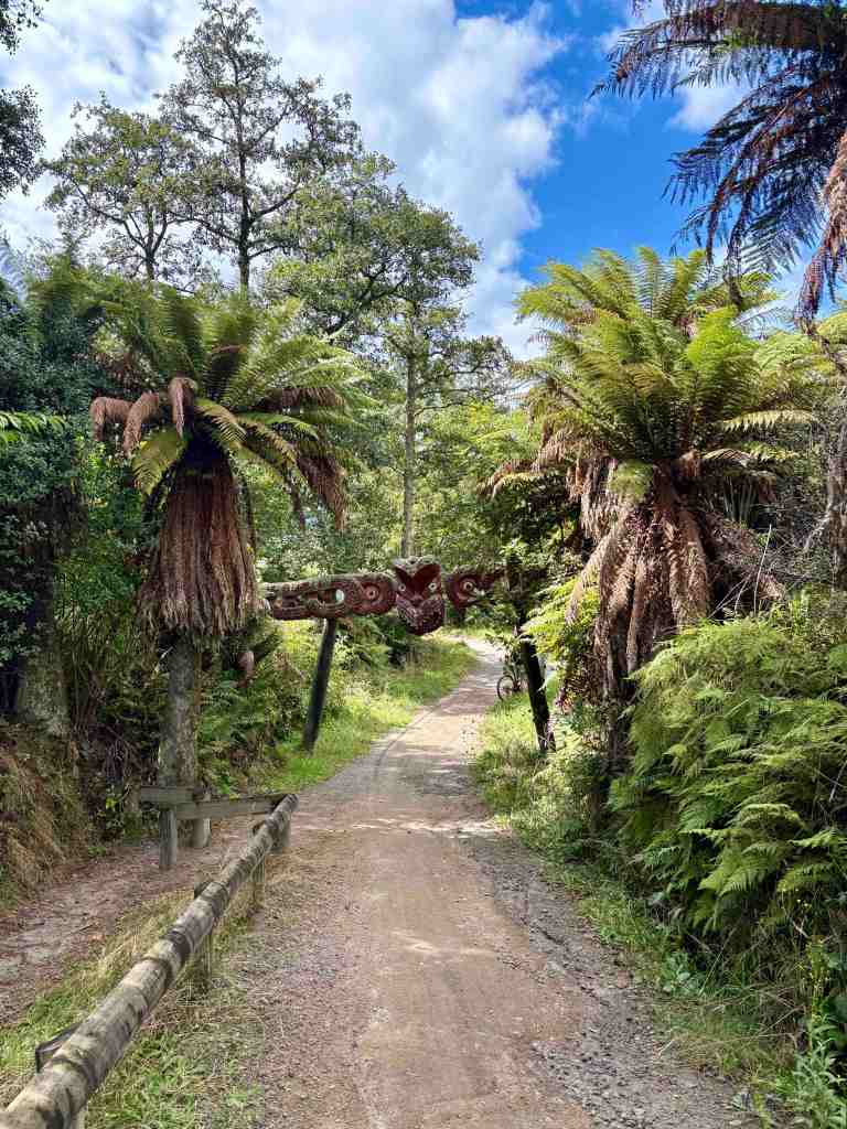 Pero fuera de aquí, la verdad es que Rotorua es una localidad completamente dedicada al turismo de pago. Es decir, si pagas un alto precio puedes ir al poblado Te Whakarewarewa o al Te Puia, con aguas geotermales y el géiser Pohutu, el más espectacular, puedes asistir a un espectáculo de Waka, degustar comida tradicional maorí… Si no pagas, parece que te lo venden como que no merece la pena, pero no es así. Se puede dar una vuelta en bicicleta por el pueblo, pasear por todo el paseo que recorre la orilla del lago, ver las aguas termales del Lago Rotorua, el parque Kuirau también con fumarolas y otras actividades termales, los Government Gardens o ver, como dije, el auténtico poblado maorí Ohinemutu. Todas estas actividades son las que nosotros hicimos por la tarde en nuestro día completo en Rotorua, pues la mañana, como amantes de la bicicleta que somos, la dedicamos a hacer la ruta Termal By Bike, también llamada Te Ara Ahi. Aquí fue cuando nos empezó a decepcionar más aún la localidad, pues según las opiniones leídas, parecía ser una ruta frecuentada y acondicionada para parar en varios puntos interesantes mencionados antes (los cuales aún no sabíamos que eran de pago). No sé en qué momento recomendaron esta ruta en las guías, poniéndola como una de las mejores rutas de un día en el país, porque realmente no hay mucho que ver. Me explico. La primera parte, en los alrededores del lago justo en las inmediaciones del pueblo es interesante, pues pedaleamos entre aguas repletas de actividad volcánica. Después, tomamos un camino entre la vegetación hasta llegar al Redwoods Mountain Bike Park, un lugar perfecto para los amantes de esta modalidad de ciclismo. Pero a partir de ahí, el resto del camino, es un mal carril bici adosado a una carretera súper ruidosa, porque tiene muchísimo tráfico, y no hay quien vaya por ahí intentando disfrutar de algo… Decidimos dar la vuelta a mitad de camino y disfrutar de las cosas mencionadas en el párrafo anterior. Quizá la otra mitad del camino era algo más bonita, pero nosotros decidimos no comprobarlo después de habernos decepcionado con la primera parte.