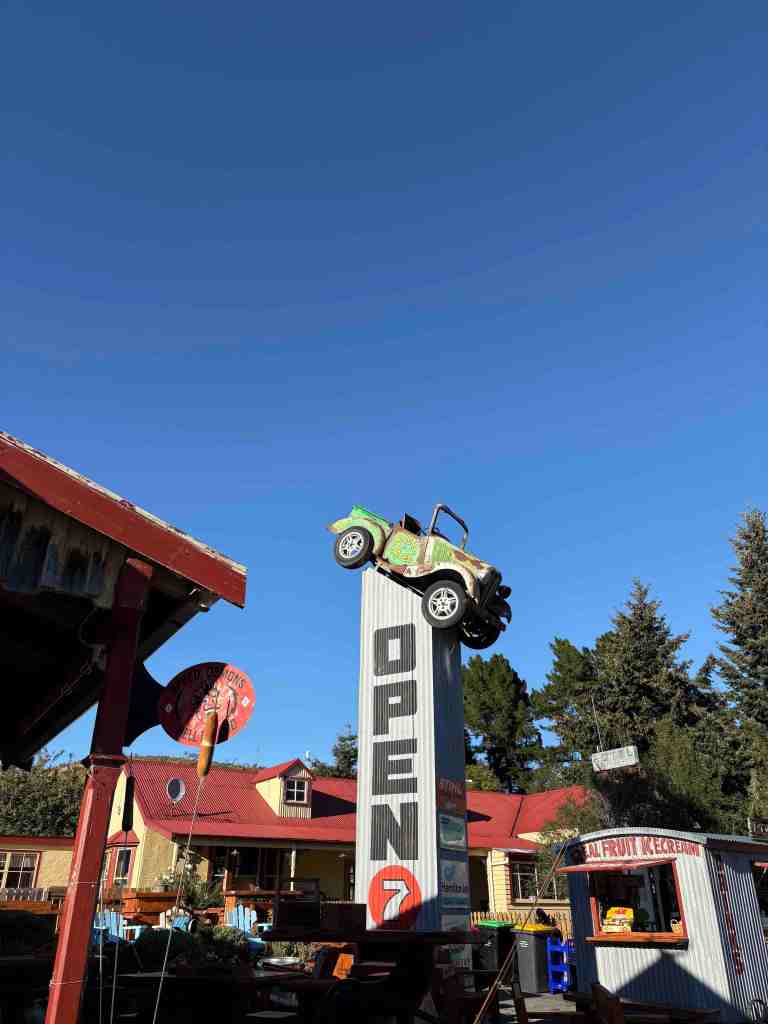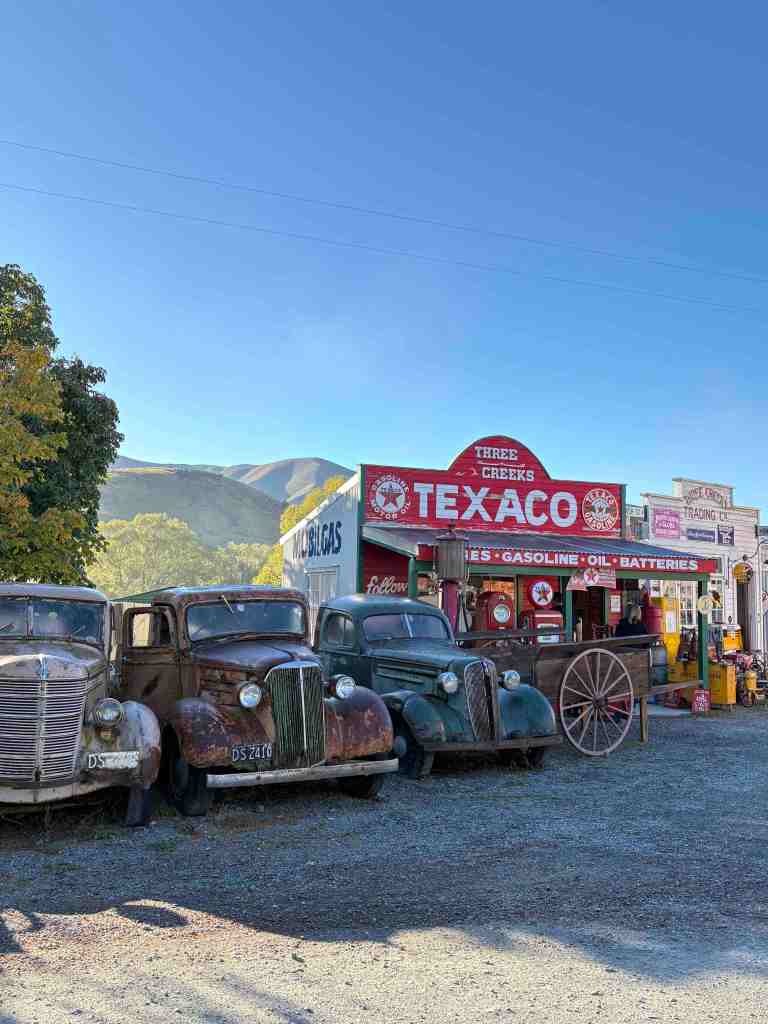 Nuestras maletas están preparadas para iniciar el camino a Christchurch, en el que será nuestro último día completo en el país. La primera parada es sólo a media hora del Lago Tekapo, en un curioso lugar llamado Burkes Pass, donde a alguien le dio por coleccionar coches y trastos antiguos y exhibirlos además de venderlos allí, en medio de la nada.