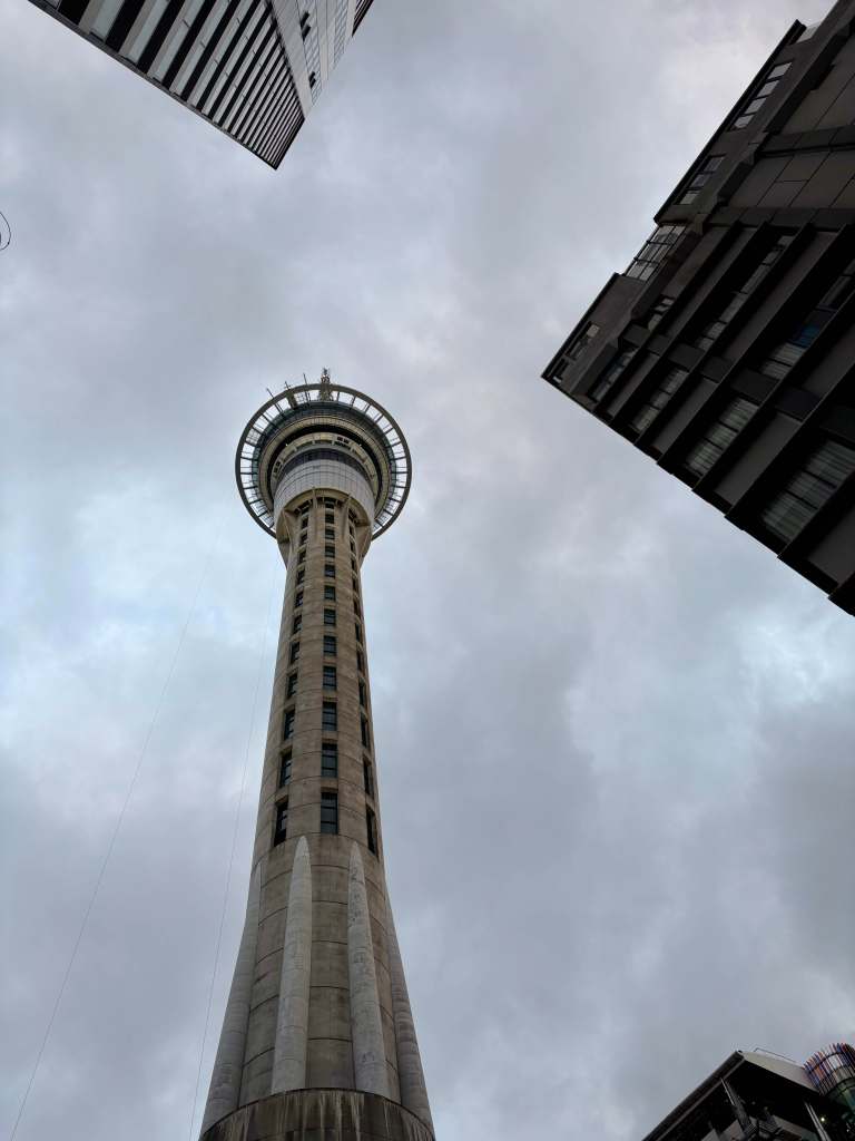 Tras la búsqueda infructuosa de la puesta de sol, nos acercamos a la Sky Tower para ver si podíamos tener una bonita vista desde allí, pero el cielo se cubrió y comenzó a lloviznar, por lo que nos retiramos sin ver la puesta de sol deseada… Hay que decir que esta famosa torre, además de tener buenas vistas, tiene una gran experiencia para los más osados: se trata de una plataforma circular con suelo de cristal, suspendida a más de 190 metros, por la que se puede hacer pasear sujetos a varios arneses. ¡De vértigo!