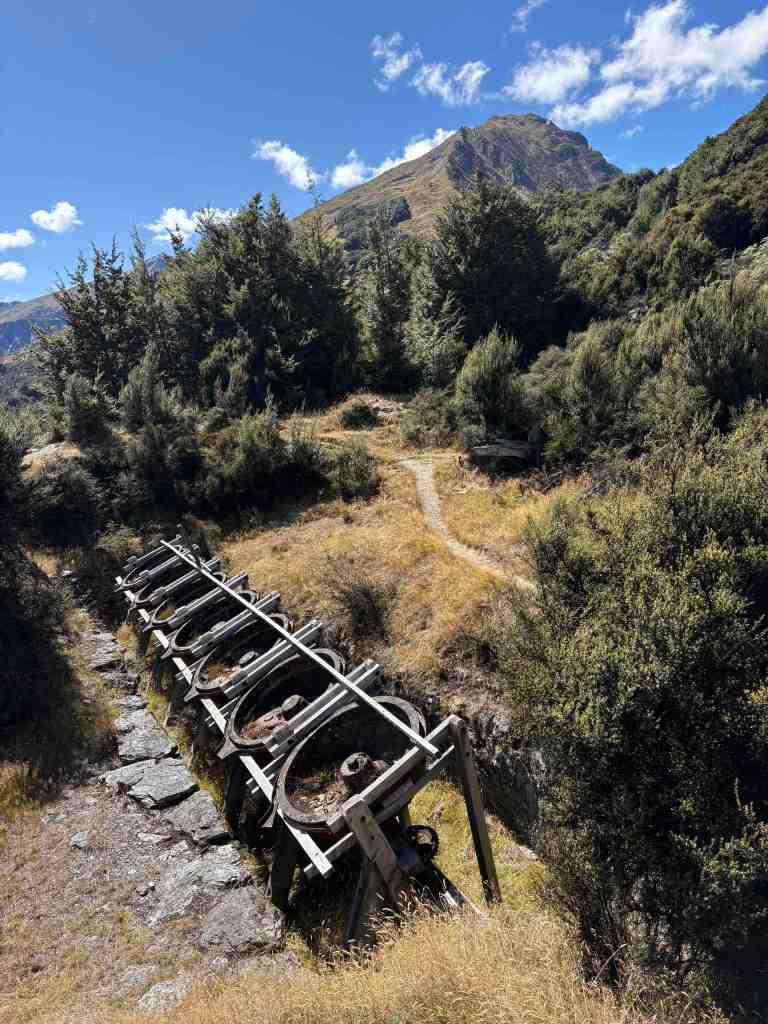 Sin prisa por la mañana, cogemos el coche para dirigirnos al precioso pueblo de Glenorchy, una pequeñita aldea rodeada de montañas que descargan el agua glaciar en un bonito rio de color azul intenso. Pero lo más bonito no es el pueblo en sí, es el camino que nos lleva hasta allí. La carretera entre Queenstown y Glenorchy discurre junto al Lago Wakatipu y las vistas a lo largo de los aproximadamente 45 minutos de camino que nos separan entre ambas ciudades son maravillosas. A lo largo de la carretera tenemos varios miradores y senderos cortos para andar, pero nosotros vamos directamente a Glenorchy porque nuestra intención es hacer un corto trekking de un par de horas llamado Invencible Mine Trail, desde donde se tienen buenas vistas de las montañas, los glaciares, y se llega a un emplazamiento en el que podemos ver los restos de las antiguas minas de oro que se explotaron aquí en 1880.