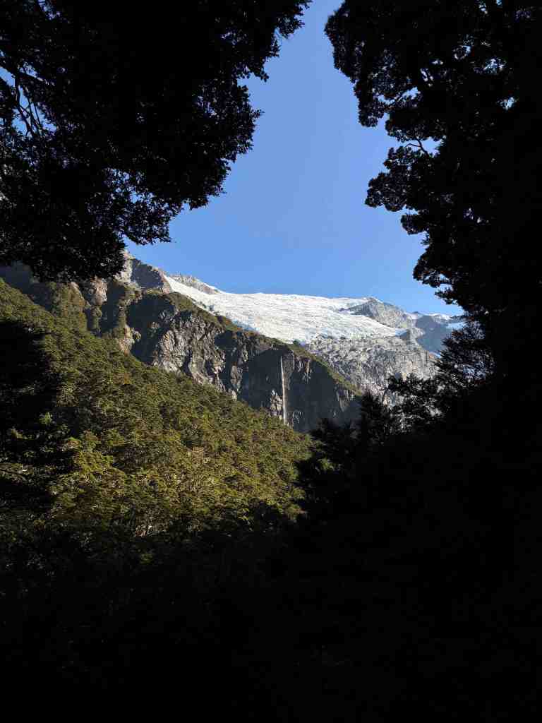 Despertamos temprano, porque habíamos oido que el parking podría llenarse, ya que desde allí también salen otros senderos, algunos de varios días de duración; y hacia las 9 de la mañana, teníamos nuestro coche aparcado en un enorme parking con suficientes espacios libres todavía. La ruta empieza en el aparcamiento y tras unos metros caminando en plano y atravesando un puente colgante, empezamos a internarnos en el bosque sombrío. A partir de ahí es prácticamente de subida todo el tiempo, pero una subida asequible, bien señalizada y mantenida durante el verano, pues hay incluso un tramo en el que tenemos que subir varias escaleras. En invierno y primavera es más complicado hacerla (o incluso imposible) debido al gran riesgo de avalanchas. Tras casi hora y media subiendo, empezamos a tener las mejores vistas: con el rio a nuestro lado, la cascada más impresionante y los glaciares derritiéndose al calor del sol como telón de fondo. El paisaje es bucólico. Sin duda, uno de los más bonitos que hasta la fecha hemos visto en Nueva Zelanda.