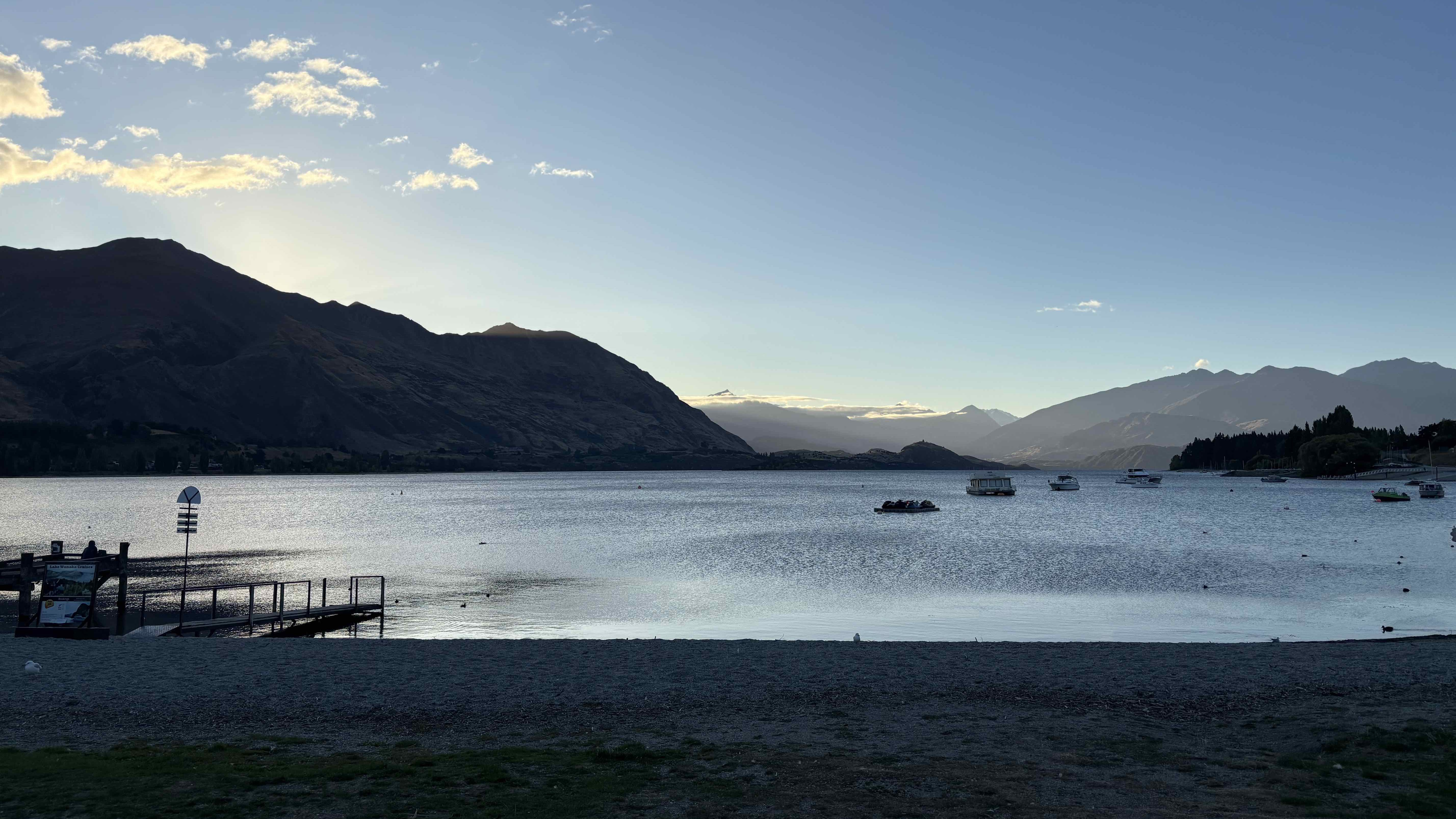Algo antes del anochecer, llegamos a Wanaka, donde pasearemos por las orillas del frío lago, y cenaremos antes de descansar tras un día agotador en coche.