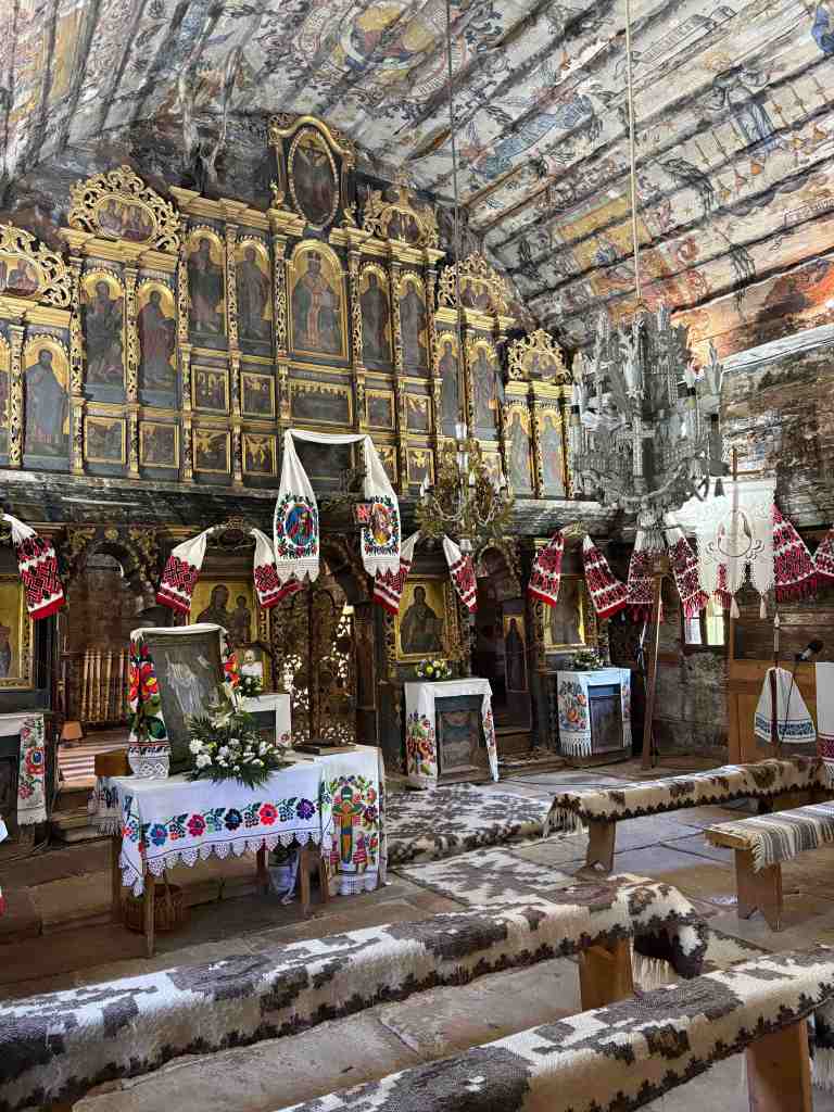 Pero en cuanto al interior, la siguiente fue la que nos dejó boquiabiertos, la iglesia de Surdesti, muy cercana a la anterior, y también muy parecida, pero en ésta el interior es mucho más colorido y los frescos están mejor conservados, además está decorada con flores frescas y paños bordados tradicionales de colores vibrantes. Si sólo pudiéramos ver el interior de una de ellas yo diría que tendría que ser el de ésta.