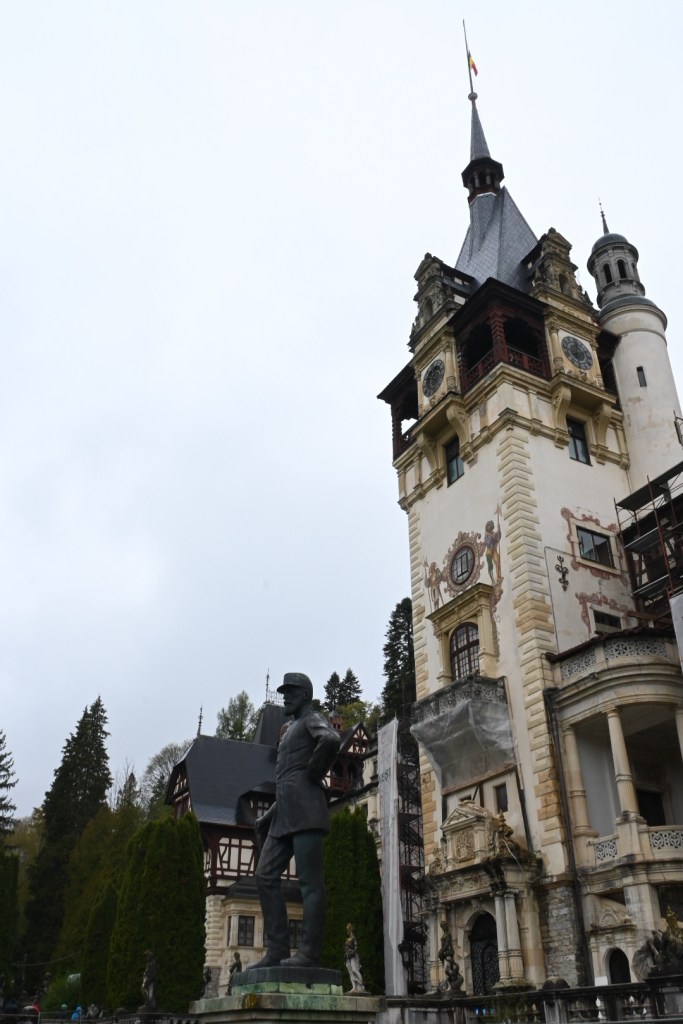 Amanecemos en la capital pero muy pronto la abandonamos para dirigirnos a la localidad de Sinaia, famosa por ser la puerta de entrada a Transilvania y albergar el neorrenacentista Castillo de Peles, así como el más pequeño situado cercano al mismo: Palacio de Pelisor. En nuestro caso, vimos ambos desde el exterior, pues los dos estaban en remodelación a la vez y decidimos que no merecía la pena entrar a pesar de que no había colas, pero las lonas que colgaban de su fachada no nos invitaban a pagar para ver un interior que quizá estaba en el mismo estado. Empezaba a llover, así que decidimos marcharnos, parando antes en el Monasterio de Sinaia, lugar clave para la formación de este pueblo que comenzó a crecer en torno al mismo. Pero también estaba en obras. Esto es lo que tiene venir en temporada baja, que los principales atractivos turísticos aprovechan para ponerse a punto para el verano.