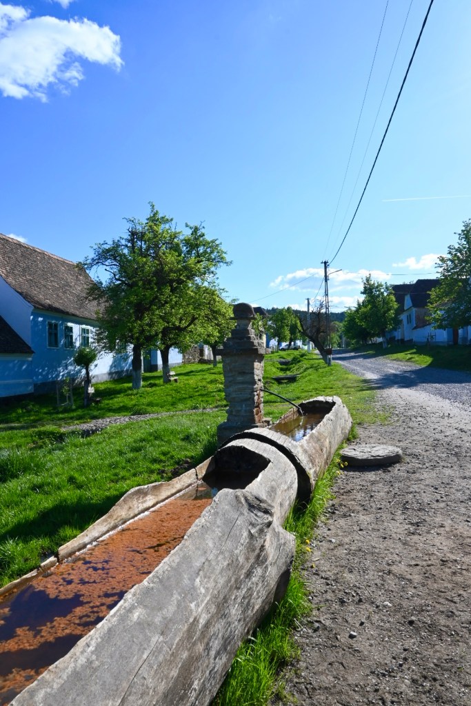 Continuamos el camino con destino Viscri, pero por el camino paramos para ver de lejos la fortificación de Rupea, recinto al que decidimos no entrar, pues en su interior solo se conservan las murallas. Desde ahí conducimos por uno de los paísajes más bonitos que hemos visto en Rumanía, entre pequeñas aldeas diseminadas a lo largo del ondulante verde intenso, en cuyo centro levantan campanarios oscuros como el de Dacia, justo antes de llegar a la localidad de Viscri. Éste último es denominado el pueblo más antiguo y tradicional del país, pero parece que ha cobrado mucho auge turístico en el último tiempo, pues está perfectamente organizado para su visita, aunque nosotros no tenemos esa sensación pues apenas nos cruzamos con otra docena de turistas. Viscri, además del propio encanto del pueblo con sus calles empedradas o de tierra, en las que el agua de los caños fluye rebosando en troncos de árboles tallados como piletas, el ganado está suelto, el transporte local son los carros de caballos, las casitas están pintadas de diferentes colores, hay paz absoluta…